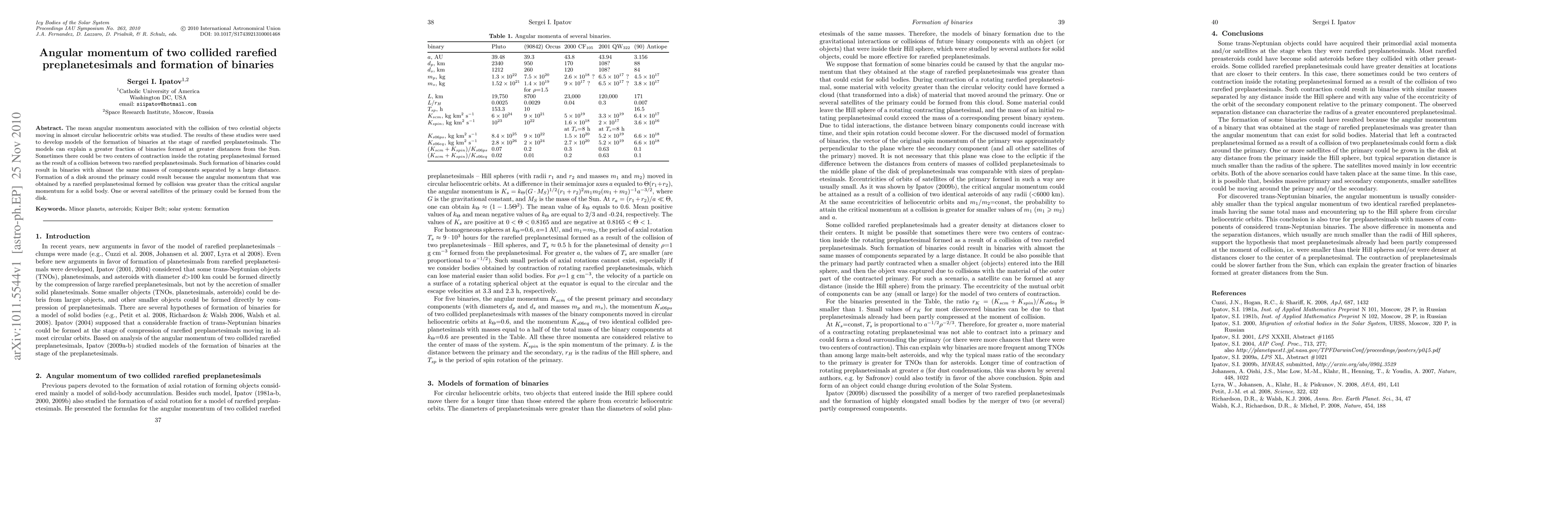 The mean angular momentum associated with the collision of two celestial objects moving in almost circular heliocentric orbits was studied. The results of these studies were used to develop models of the formation of binaries at the stage of rarefied preplanetesimals. The models can explain a greater fraction of binaries formed at greater distances from the Sun. Sometimes there could be two centers of contraction inside the rotating preplanetesimal formed as the result of a collision between two rarefied preplanetesimals. Such formation of binaries could result in binaries with almost the same masses of components separated by a large distance. Formation of a disk around the primary could result because the angular momentum that was obtained by a rarefied preplanetesimal formed by collision was greater than the critical angular momentum for a solid body. One or several satellites of the primary could be formed from the disk.