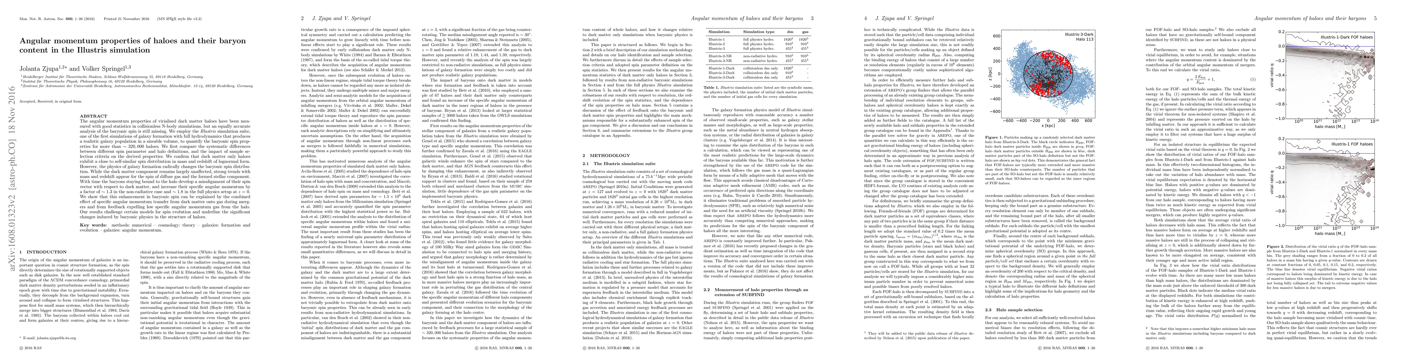 This paper investigates the angular momentum properties of dark matter haloes and their baryonic content using the Illustris simulation. It finds that while dark matter haloes exhibit a self-similar spin distribution, baryonic components like gas and stars show significant changes in spin due to galaxy formation processes, including angular momentum transfer and feedback effects.