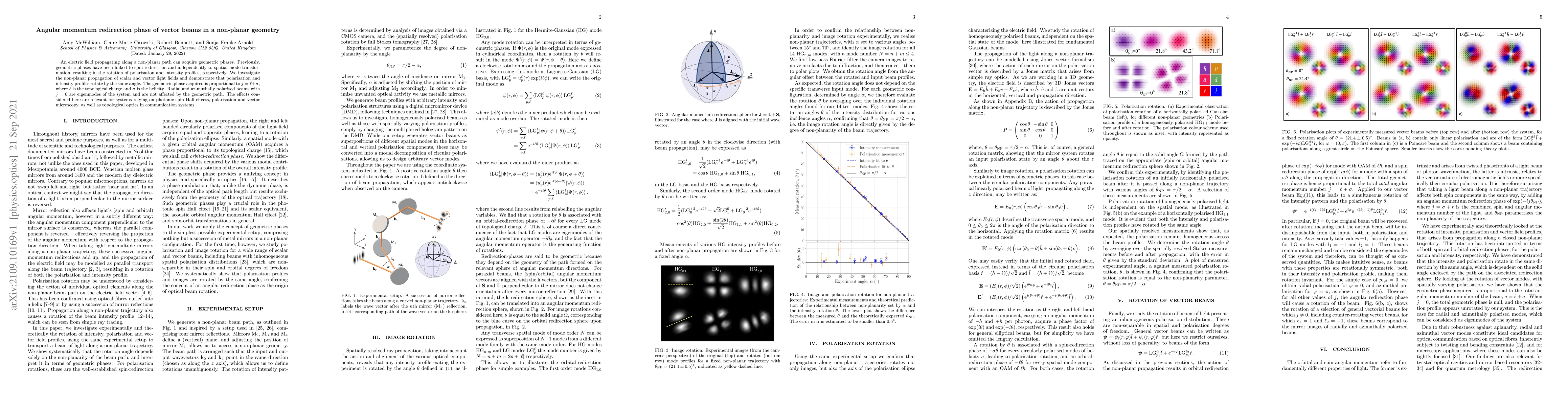 This paper investigates the angular momentum redirection of vector beams during non-planar propagation, demonstrating that both polarisation and intensity profiles rotate by the same angle due to acquired geometric phases. The study highlights the significance of topological charge and helicity in determining these effects, with implications for photonic spin Hall effects and topological optics in communication systems.