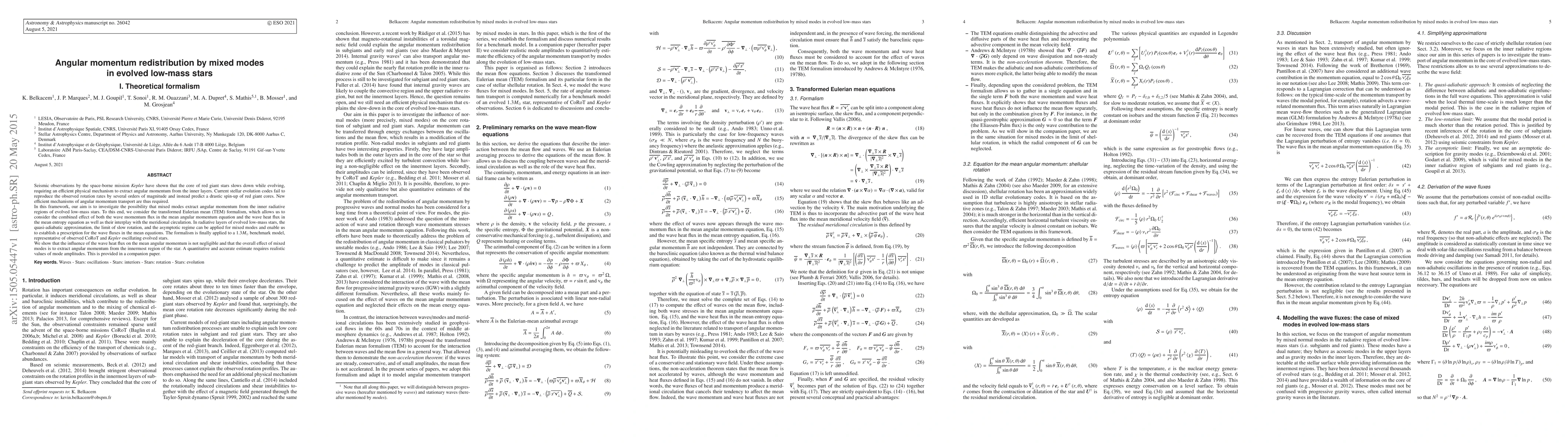 This paper develops a theoretical framework using the Transformed Eulerian Mean formalism to explore how mixed modes in evolved low-mass stars redistribute angular momentum, addressing the discrepancy between observed and predicted rotation rates in red giant stars. The formalism accounts for wave momentum and heat fluxes, showing that mixed modes can extract angular momentum from the star's core.