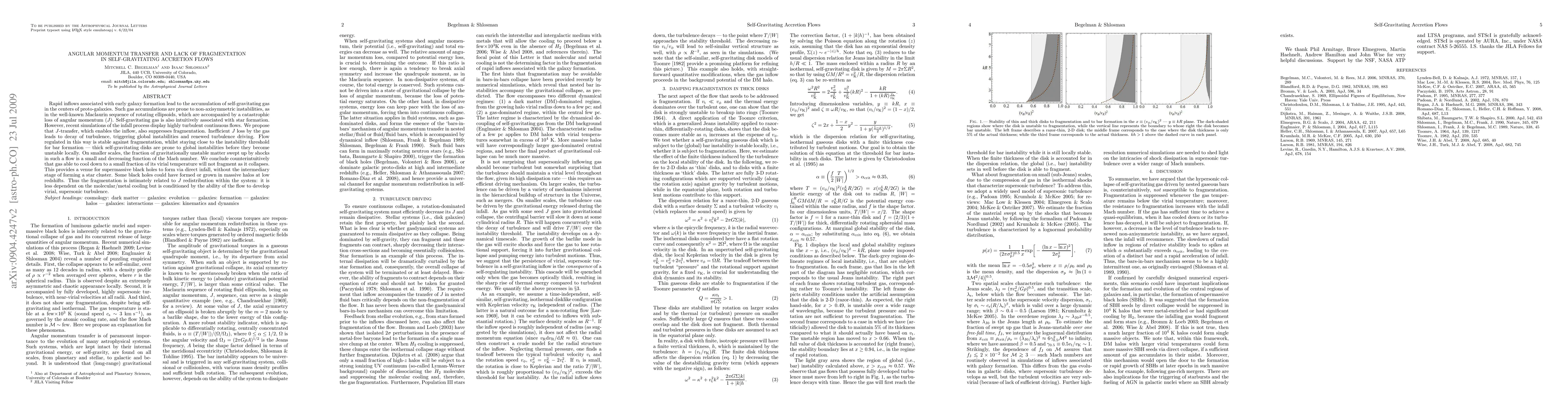 Rapid inflows associated with early galaxy formation lead to the accumulation of self-gravitating gas in the centers of proto-galaxies. Such gas accumulations are prone to non-axisymmetric instabilities, as in the well-known Maclaurin sequence of rotating ellipsoids, which are accompanied by a catastrophic loss of angular momentum (J). Self-gravitating gas is also intuitively associated with star formation. However, recent simulations of the infall process display highly turbulent continuous flows. We propose that J-transfer, which enables the inflow, also suppresses fragmentation. Inefficient J loss by the gas leads to decay of turbulence, triggering global instabilities and renewed turbulence driving. Flow regulated in this way is stable against fragmentation, whilst staying close to the instability threshold for bar formation -- thick self-gravitating disks are prone to global instabilities before they become unstable locally. On smaller scales, the fraction of gravitationally unstable matter swept up by shocks in such a flow is a small and decreasing function of the Mach number. We conclude counterintuitively that gas able to cool down to a small fraction of its virial temperature will not fragment as it collapses. This provides a venue for supermassive black holes to form via direct infall, without the intermediary stage of forming a star cluster. Some black holes could have formed or grown in massive halos at low redshifts. Thus the fragmentation is intimately related to J redistribution within the system: it is less dependent on the molecular and metal cooling but is conditioned by the ability of the flow to develop virial, supersonic turbulence.
