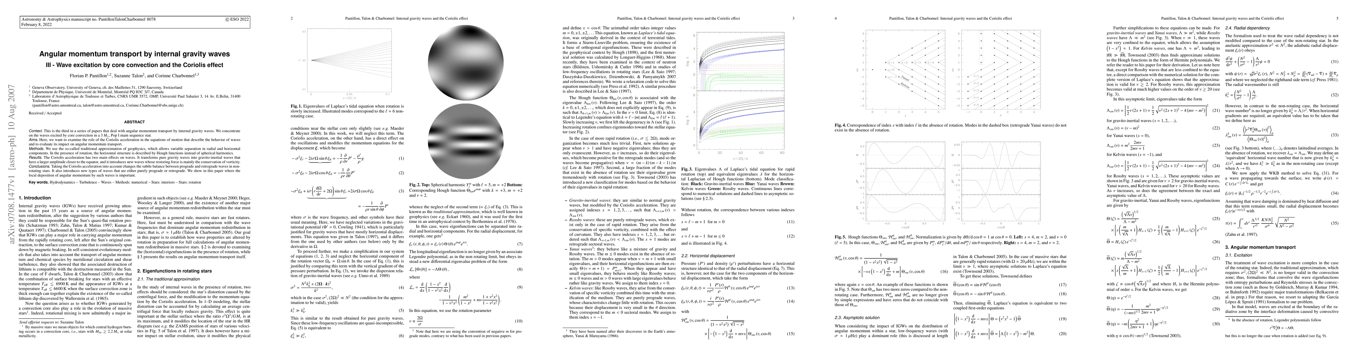 This paper investigates angular momentum transport by internal gravity waves in a 3Msun star, focusing on wave excitation by core convection and the Coriolis effect. The Coriolis acceleration transforms pure gravity waves into gravito-inertial waves and introduces new wave types, altering the balance between prograde and retrograde waves and impacting angular momentum transport.