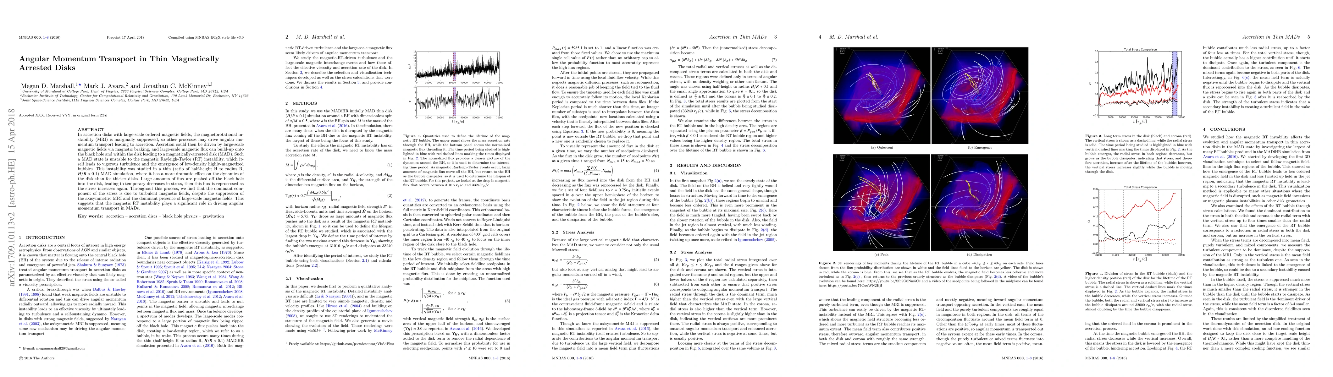 This study investigates angular momentum transport in thin magnetically arrested disks (MADs), finding that the magnetic Rayleigh-Taylor instability generates low-density bubbles that reduce stress in the disk, facilitating angular momentum transport. Despite the dominance of large-scale magnetic fields, turbulent magnetic fields are the primary driver of stress, highlighting the importance of the magnetic RT instability in MAD dynamics.