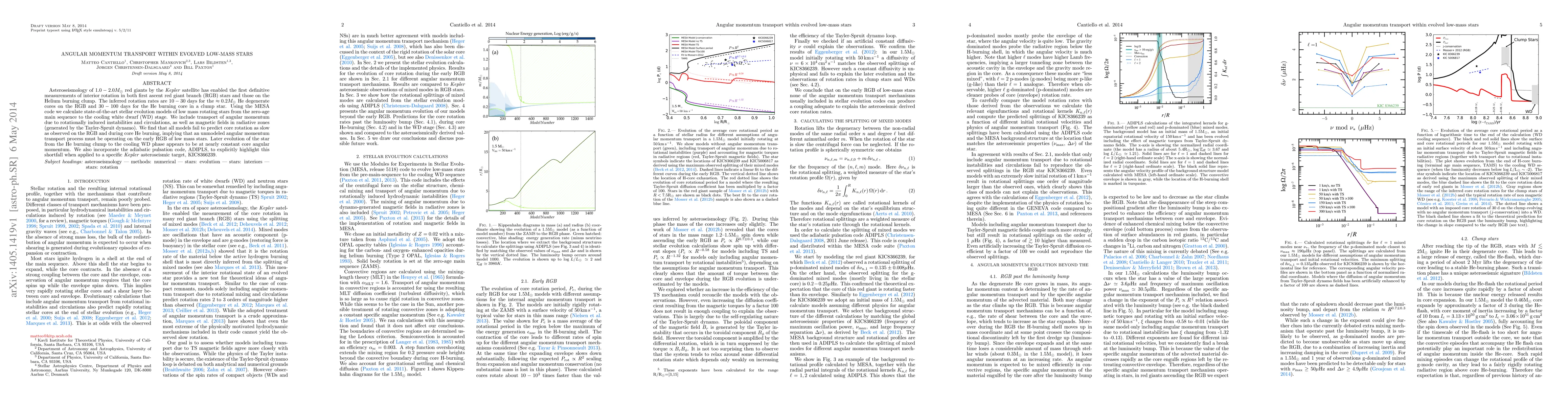 Asteroseismology of 1.0-2.0 Msun red giants by the Kepler satellite has enabled the first definitive measurements of interior rotation in both first ascent red giant branch (RGB) stars and those on the Helium burning clump. The inferred rotation rates are 10-30 days for the ~0.2Msun He degenerate cores on the RGB and 30-100 days for the He burning core in a clump star. Using the MESA code we calculate state-of-the-art stellar evolution models of low mass rotating stars from the zero-age main sequence to the cooling white dwarf (WD) stage. We include transport of angular momentum due to rotationally induced instabilities and circulations, as well as magnetic fields in radiative zones (generated by the Tayler-Spruit dynamo). We find that all models fail to predict core rotation as slow as observed on the RGB and during core He burning, implying that an unmodeled angular momentum transport process must be operating on the early RGB of low mass stars. Later evolution of the star from the He burning clump to the cooling WD phase appears to be at nearly constant core angular momentum. We also incorporate the adiabatic pulsation code, ADIPLS, to explicitly highlight this shortfall when applied to a specific Kepler asteroseismic target, KIC8366239. The MESA inlist adopted to calculate the models in this paper can be found at \url{https://authorea.com/1608/} (bottom of the document).