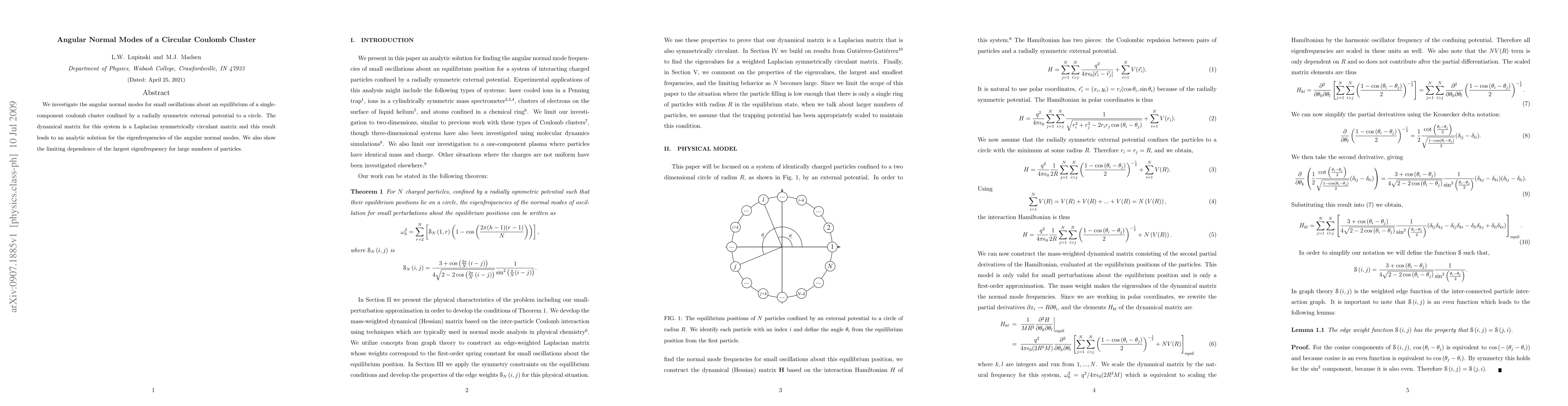 We investigate the angular normal modes for small oscillations about an equilibrium of a single-component coulomb cluster confined by a radially symmetric external potential to a circle. The dynamical matrix for this system is a Laplacian symmetrically circulant matrix and this result leads to an analytic solution for the eigenfrequencies of the angular normal modes. We also show the limiting dependence of the largest eigenfrequency for large numbers of particles.