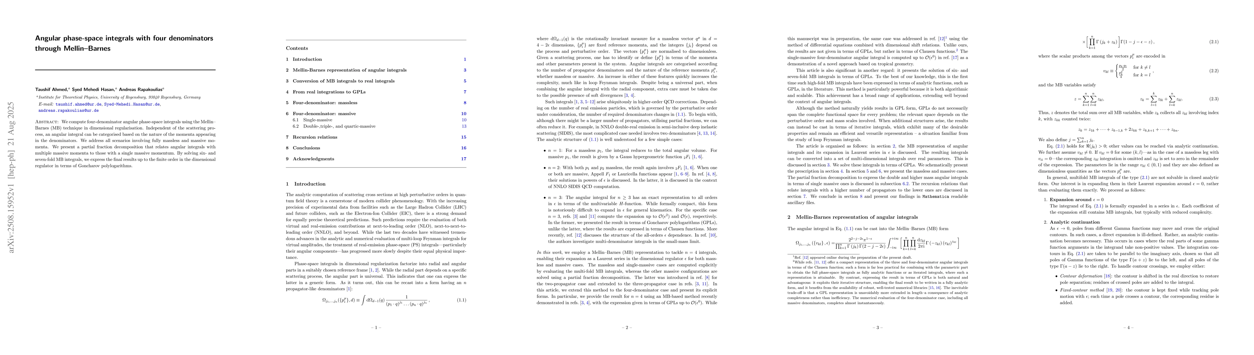 We compute four-denominator angular phase-space integrals using the Mellin--Barnes (MB) technique in dimensional regularisation. Independent of the scattering process, an angular integral can be categorised based on the nature of the momenta appearing in the denominators. We address all scenarios involving fully massless and massive momenta. We present a partial fraction decomposition that relates angular integrals with multiple massive momenta to those with a single massive momentum. By solving six- and seven-fold MB integrals, we express the final results up to the finite order in the dimensional regulator in terms of Goncharov polylogarithms.
