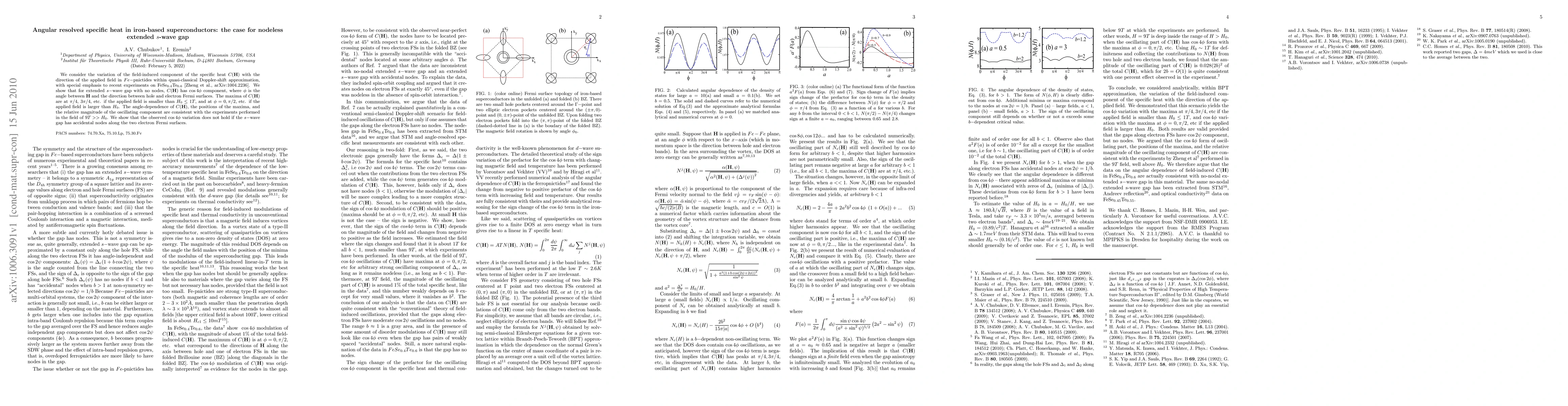 We consider the variation of the field-induced component of the specific heat $C({\bf H})$ with the direction of the applied field in $Fe-$pnictides within quasi-classical Doppler-shift approximation, with special emphasis to recent experiments on FeSe$_{0.4}$Te$_{0.6}$ [Zheng et al., arXiv:1004.2236]. We show that for extended $s-$wave gap with no nodes, $C({\bf H})$ has $\cos 4 \phi$ component, where $\phi$ is the angle between ${\bf H}$ and the direction between hole and electron Fermi surfaces. The maxima of $C({\bf H})$ are at $\pi/4$, $3\pi/4$, etc. if the applied field is smaller than $H_0 \leq 1T$, and at $\phi =0, \pi/2$, etc. if the applied field is larger than $H_0$. The angle-dependence of $C({\bf H})$, the positions of the maxima, and the relative magnitude of the oscillating component are consistent with the experiments performed in the field of $9T >> H_0$. We show that the observed $\cos 4 \phi$ variation does not hold if the $s-$wave gap has accidental nodes along the two electron Fermi surfaces.