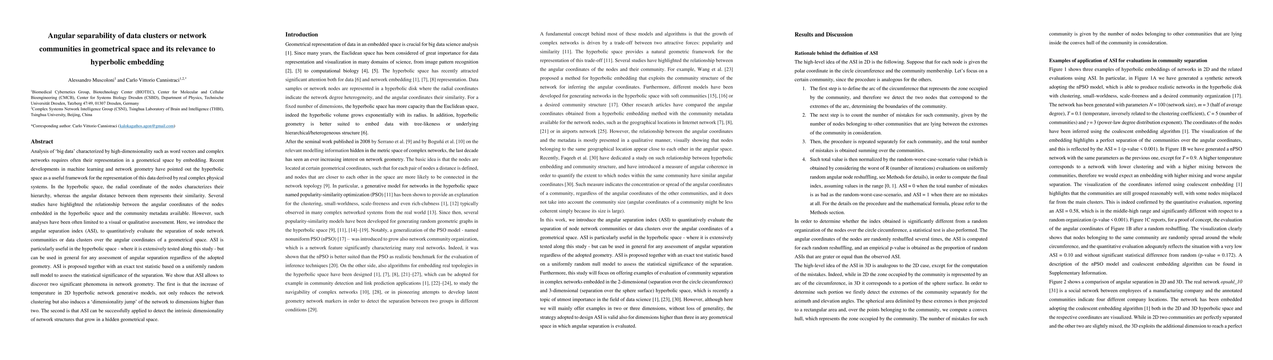 Analysis of 'big data' characterized by high-dimensionality such as word vectors and complex networks requires often their representation in a geometrical space by embedding. Recent developments in machine learning and network geometry have pointed out the hyperbolic space as a useful framework for the representation of this data derived by real complex physical systems. In the hyperbolic space, the radial coordinate of the nodes characterizes their hierarchy, whereas the angular distance between them represents their similarity. Several studies have highlighted the relationship between the angular coordinates of the nodes embedded in the hyperbolic space and the community metadata available. However, such analyses have been often limited to a visual or qualitative assessment. Here, we introduce the angular separation index (ASI), to quantitatively evaluate the separation of node network communities or data clusters over the angular coordinates of a geometrical space. ASI is particularly useful in the hyperbolic space - where it is extensively tested along this study - but can be used in general for any assessment of angular separation regardless of the adopted geometry. ASI is proposed together with an exact test statistic based on a uniformly random null model to assess the statistical significance of the separation. We show that ASI allows to discover two significant phenomena in network geometry. The first is that the increase of temperature in 2D hyperbolic network generative models, not only reduces the network clustering but also induces a 'dimensionality jump' of the network to dimensions higher than two. The second is that ASI can be successfully applied to detect the intrinsic dimensionality of network structures that grow in a hidden geometrical space.