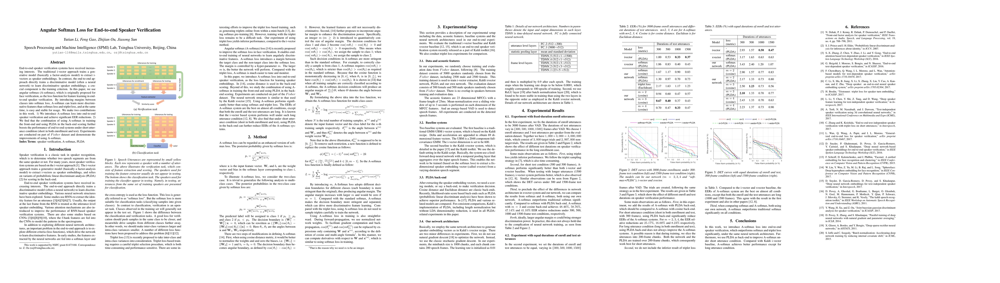 This paper introduces angular softmax (A-softmax) loss for end-to-end speaker verification, achieving significant Equal Error Rate (EER) reductions compared to softmax and triplet losses. The combination of A-softmax with PLDA in the back-end further enhances performance under short utterance conditions.