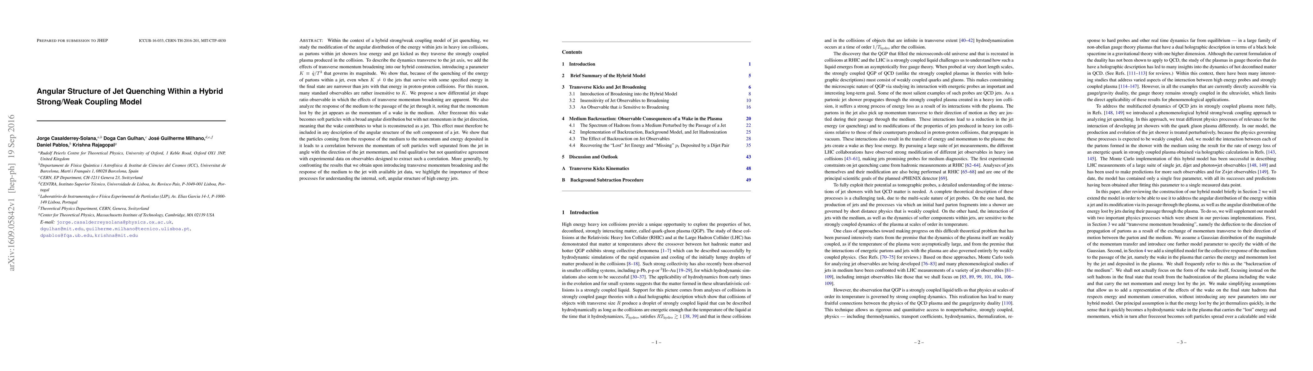 Within the context of a hybrid strong/weak coupling model of jet quenching, we study the modification of the angular distribution of the energy within jets in heavy ion collisions, as partons within jet showers lose energy and get kicked as they traverse the strongly coupled plasma produced in the collision. To describe the dynamics transverse to the jet axis, we add the effects of transverse momentum broadening into our hybrid construction, introducing a parameter $K\equiv \hat q/T^3$ that governs its magnitude. We show that, because of the quenching of the energy of partons within a jet, even when $K\neq 0$ the jets that survive with some specified energy in the final state are narrower than jets with that energy in proton-proton collisions. For this reason, many standard observables are rather insensitive to $K$. We propose a new differential jet shape ratio observable in which the effects of transverse momentum broadening are apparent. We also analyze the response of the medium to the passage of the jet through it, noting that the momentum lost by the jet appears as the momentum of a wake in the medium. After freezeout this wake becomes soft particles with a broad angular distribution but with net momentum in the jet direction. We show that the particles coming from the response of the medium to the momentum and energy deposited in it leads to a correlation between the momentum of soft particles well separated from the jet in angle with the direction of the jet momentum, and find qualitative but not quantitative agreement with experimental data on observables designed to extract such a correlation. By confronting the results that we obtain upon introducing transverse momentum broadening and the response of the medium to the jet with available jet data, we highlight the importance of these processes for understanding the internal, soft, angular structure of high energy jets.