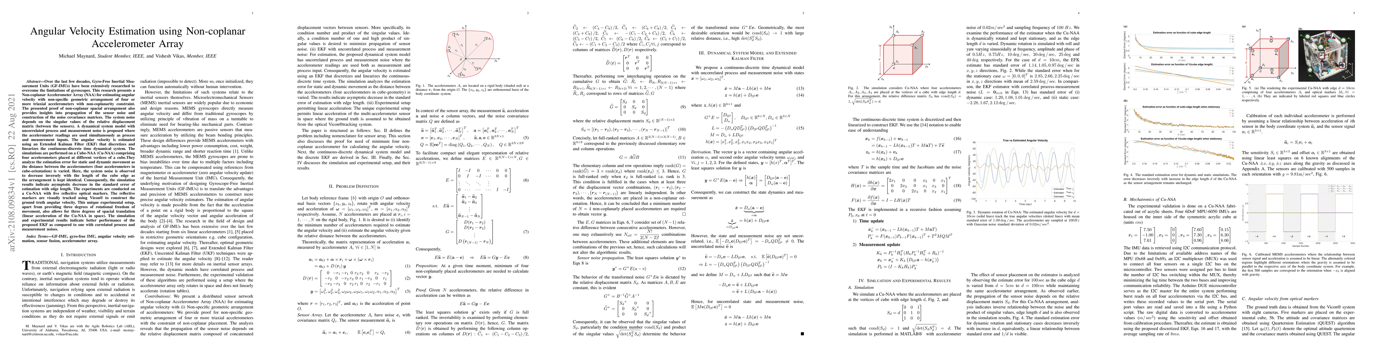 Over the last few decades, Gyro-Free IMUs have been extensively researched to overcome the limitations of gyroscopes. This research presents a Non-coplanar Accelerometer Array (NAA) for estimating angular velocity with non-specific geometric arrangement of four or more triaxial accelerometers with non-coplanarity constraint. The presented proof of non-coplanar spacial arrangement also provides insights into propagation of the sensor noise and construction of the noise covariance matrices. The system noise depends on the singular values of the relative displacement matrix (between the sensors). A dynamical system model with uncorrelated process and measurement noise is proposed where the accelerometer readings are used simultaneously as process and measurement inputs. The angular velocity is estimated using an EKF that discretizes and linearizes the continuous-discrete time dynamical system. The simulations are performed on a Cube-NAA (Cu-NAA) comprising four accelerometers placed at different vertices of a cube. They analyze the estimation error for static and dynamic movement as the distance between the accelerometers is varied. Here, the system noise is observed to decrease inversely with the length of the cube edge as the arrangement is kept identical. Consequently, the simulation results indicate asymptotic decrease in the standard error of estimation with edge length. The experiments are conducted on a Cu-NAA with five reflective optical markers. The reflective markers are visually tracked using VICON to construct the ground truth. This unique experimental setup, apart from providing three degrees of rotational freedom of movement, also allows for three degrees of spacial translation (linear acceleration of the Cu-NAA in space). The simulation and experimental results indicate better performance of the proposed EKF as compared to one with correlated process and measurement noises.