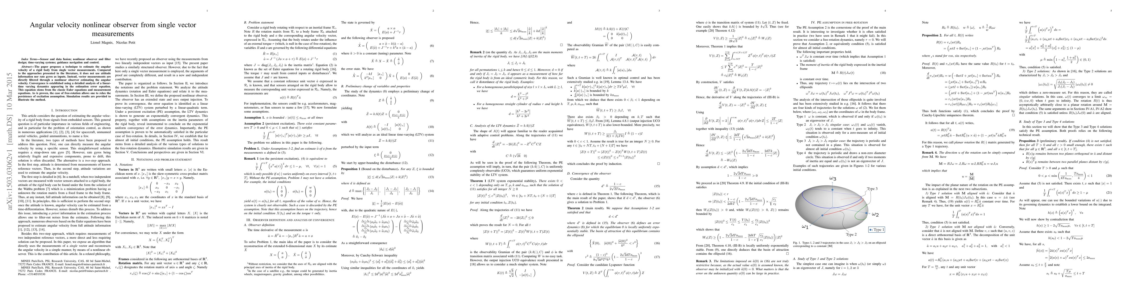 The paper proposes a technique to estimate the angular velocity of a rigid body from single vector measurements. Compared to the approaches presented in the literature, it does not use attitude information nor rate gyros as inputs. Instead, vector measurements are directly filtered through a nonlinear observer estimating the angular velocity. Convergence is established using a detailed analysis of a linear-time varying dynamics appearing in the estimation error equation. This equation stems from the classic Euler equations and measurement equations. As is proven, the case of free-rotation allows one to relax the persistence of excitation assumption. Simulation results are provided to illustrate the method.