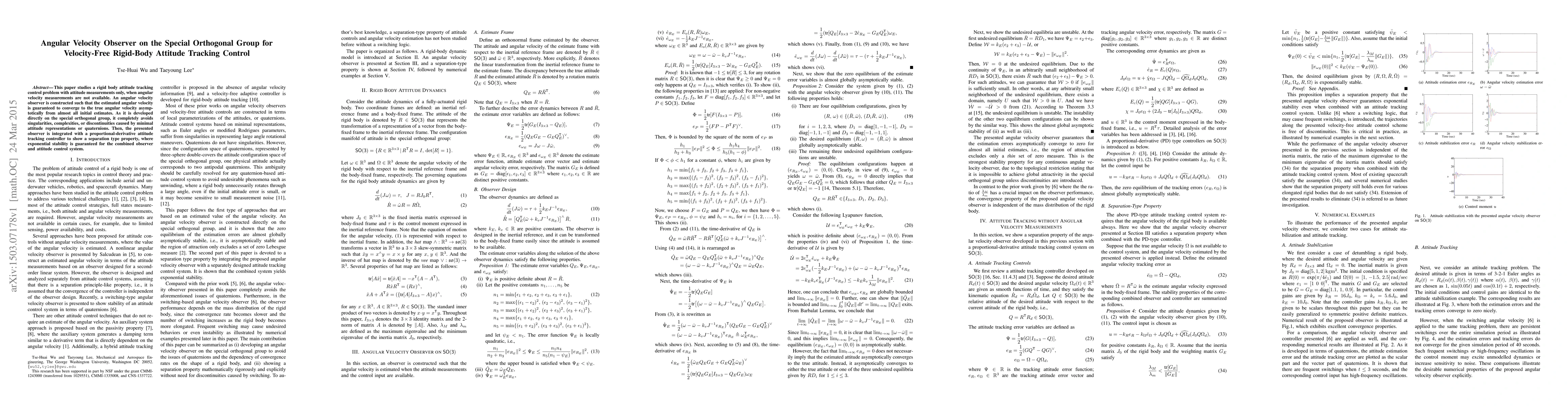 This paper studies a rigid body attitude tracking control problem with attitude measurements only, when angular velocity measurements are not available. An angular velocity observer is constructed such that the estimated angular velocity is guaranteed to converge to the true angular velocity asymptotically from almost all initial estimates. As it is developed directly on the special orthogonal group, it completely avoids singularities, complexities, or discontinuities caused by minimal attitude representations or quaternions. Then, the presented observer is integrated with a proportional-derivative attitude tracking controller to show a separation type property, where exponential stability is guaranteed for the combined observer and attitude control system.