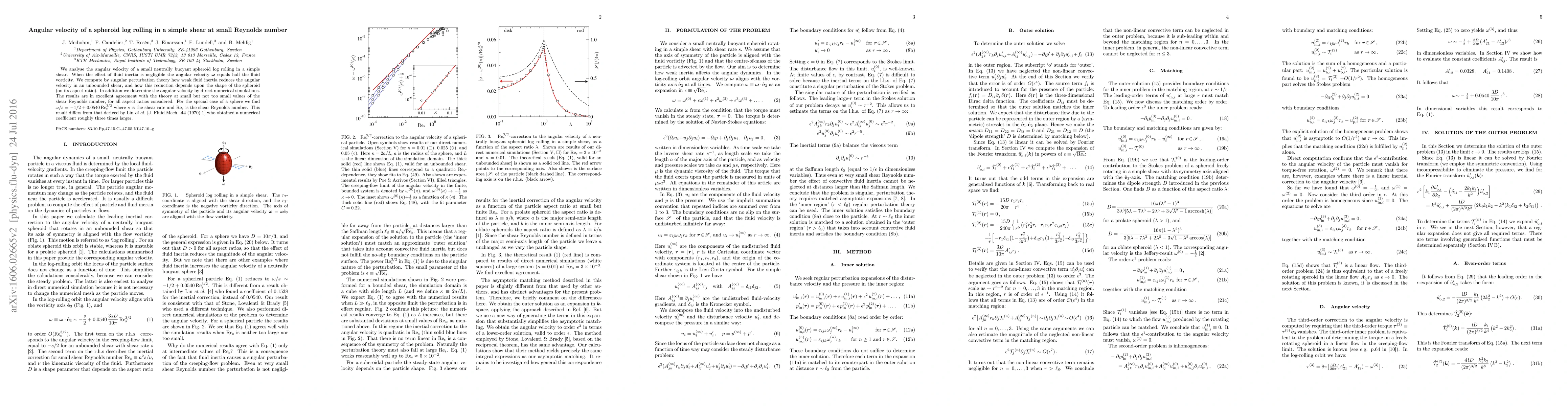 We analyse the angular velocity of a small neutrally buoyant spheroid log rolling in a simple shear. When the effect of fluid inertia is negligible the angular velocity $\omega$ equals half the fluid vorticity. We compute by singular perturbation theory how weak fluid inertia reduces the angular velocity in an unbounded shear, and how this reduction depends upon the shape of the spheroid (on its aspect ratio). In addition we determine the angular velocity by direct numerical simulations. The results are in excellent agreement with the theory at small but not too small values of the shear Reynolds number, for all aspect ratios considered. For the special case of a sphere we find $\omega/s = -1/2+0.0540\, \mbox{Re}_\mbox{s}^{3/2}$ where $s$ is the shear rate, and $\mbox{Re}_\mbox{s}$ is the shear Reynolds number. This result differs from that derived by Lin et al. [J. Fluid Mech. 44 (1970) 1] who obtained a numerical coefficient roughly three times larger.