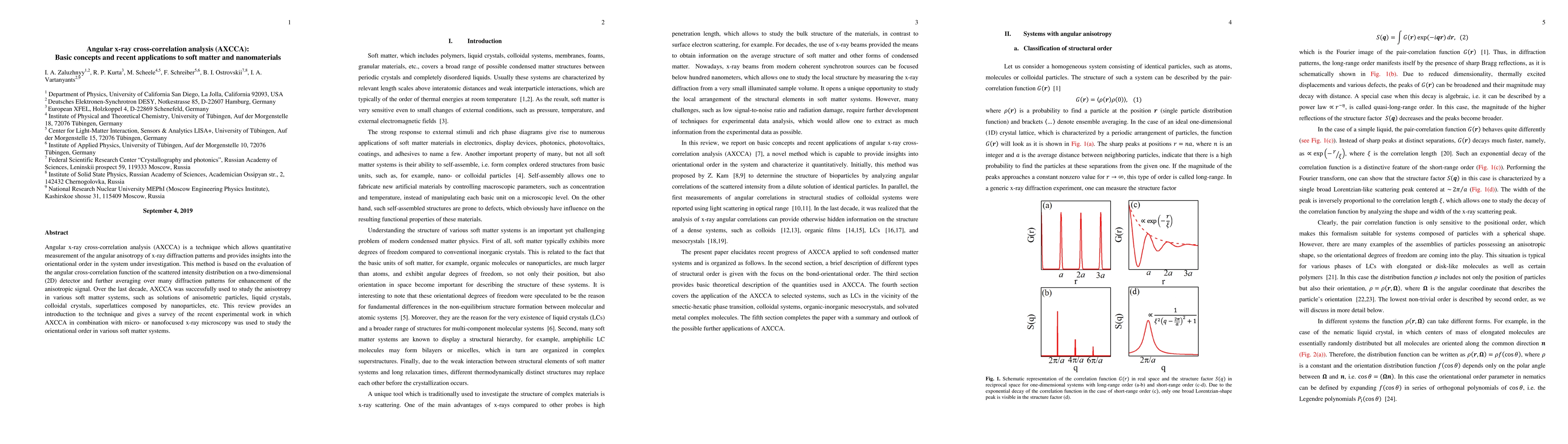This paper introduces Angular x-ray cross-correlation analysis (AXCCA) as a method for measuring angular anisotropy in x-ray diffraction patterns, providing insights into orientational order in soft matter and nanomaterials. It reviews recent applications of AXCCA in studying anisotropy in systems like liquid crystals and colloidal crystals.