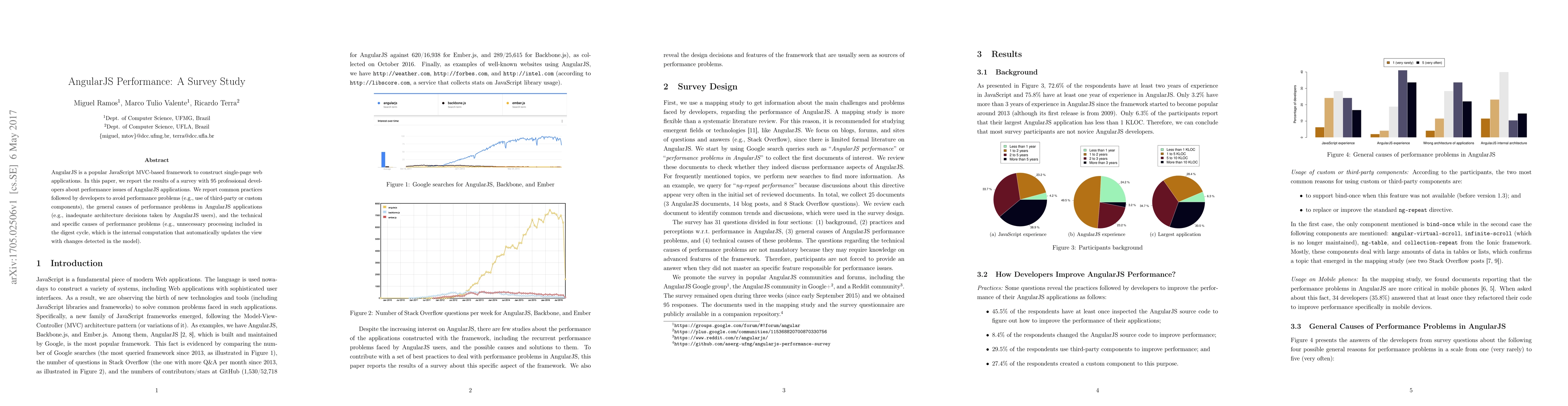 A survey of 95 professional developers found common performance issues in AngularJS applications, including inadequate architecture decisions and unnecessary processing, which can be avoided with best practices such as using third-party or custom components.