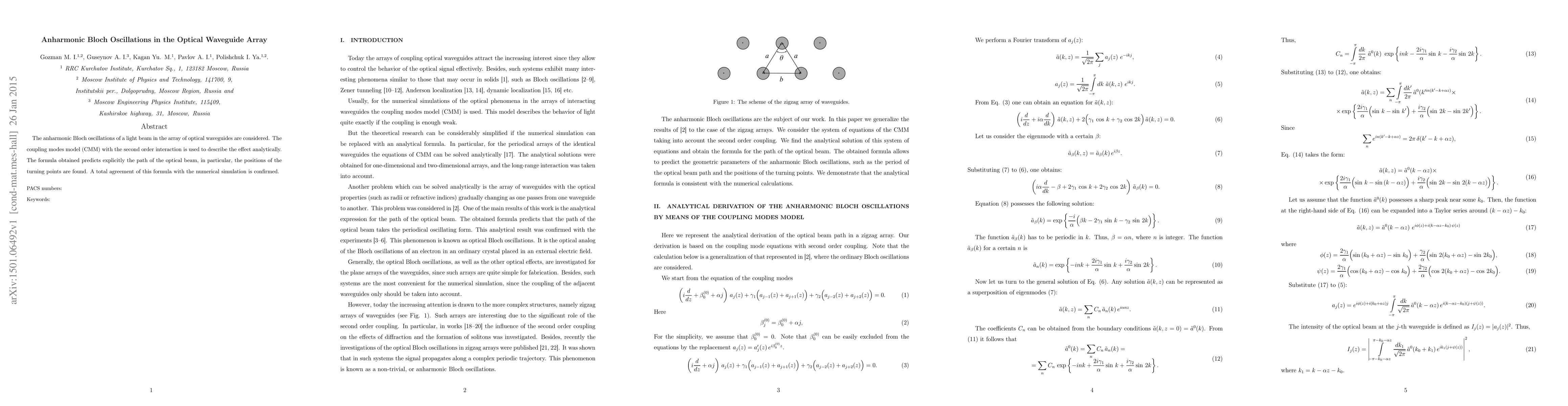 This paper investigates anharmonic Bloch oscillations in an optical waveguide array using the coupling modes model, predicting the light beam's path and turning points, with results confirmed by numerical simulations.