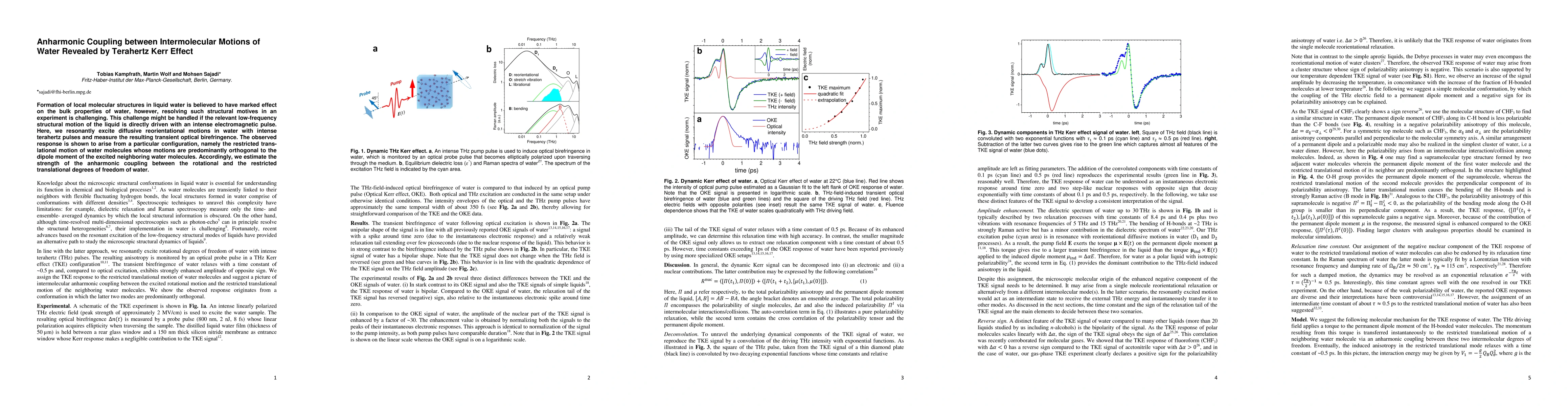 This study uses terahertz pulses to excite and measure the transient optical birefringence in water, revealing anharmonic coupling between rotational and restricted translational motions of water molecules, which are orthogonal to the dipole moment of neighboring molecules. The findings provide insights into the local molecular structures influencing water's bulk properties.