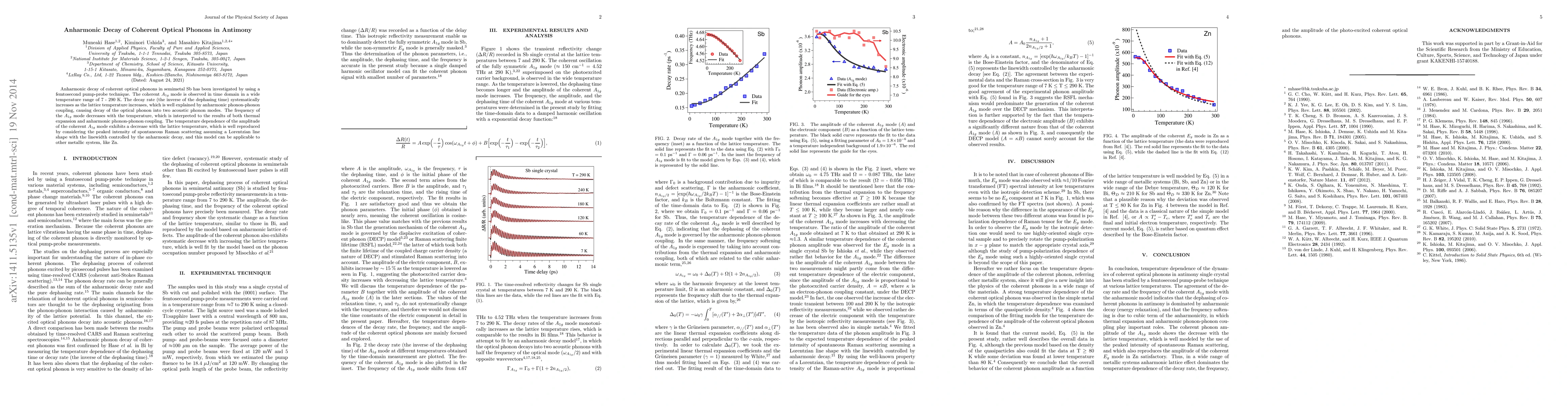 This study investigates the anharmonic decay of coherent optical phonons in antimony using femtosecond pump-probe techniques. The decay rate increases with temperature due to phonon-phonon coupling, leading to the breakdown of the optical phonon into acoustic phonons, while temperature-dependent frequency changes are attributed to thermal expansion and anharmonic coupling.