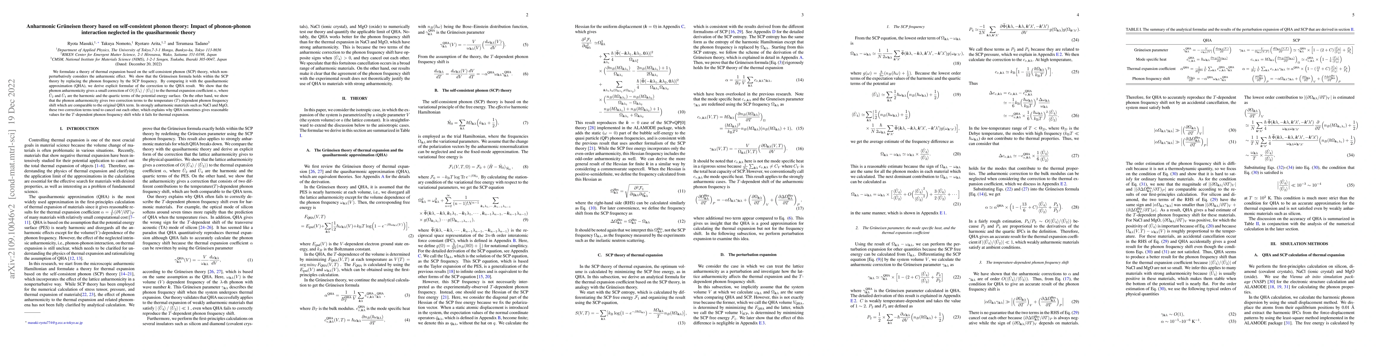 We formulate a theory of thermal expansion based on the self-consistent phonon (SCP) theory, which nonperturbatively considers the anharmonic effect. We show that the Gr\"unseisen formula holds within the SCP theory by replacing the phonon frequency by the SCP frequency. By comparing it with the quasiharmonic approximation (QHA), we derive explicit formulas of the correction to the QHA result. We show that the phonon anharmonicity gives a small correction of $O(\langle{\hat{U}_4\rangle}/\langle{\hat{U}_2\rangle})$ to the thermal expansion coefficient $\alpha$, where $\hat{U}_2$ and $\hat{U}_4$ are the harmonic and the quartic terms of the potential energy surface. On the other hand, we show that the phonon anharmonicity gives two correction terms to the temperature ($T$)-dependent phonon frequency shift which are comparable to the original QHA term. In strongly anharmonic materials such as NaCl and MgO, these two correction terms tend to cancel out each other, which explains why the QHA sometimes gives reasonable values for the $T$-dependent phonon frequency shift while it fails for thermal expansion.