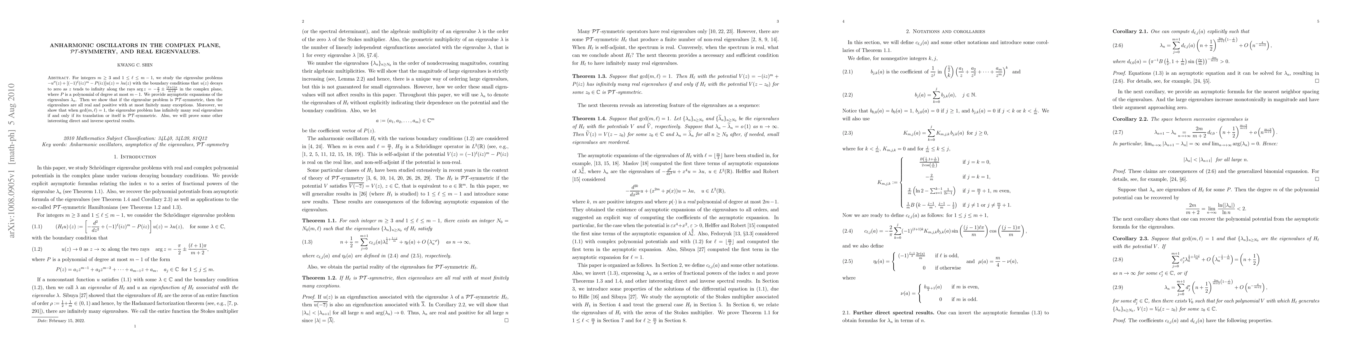 For integers $m\geq 3$ and $1\leq\ell\leq m-1$, we study the eigenvalue problems $-u^{\prime\prime}(z)+[(-1)^{\ell}(iz)^m-P(iz)]u(z)=\lambda u(z)$ with the boundary conditions that $u(z)$ decays to zero as $z$ tends to infinity along the rays $\arg z=-\frac{\pi}{2}\pm \frac{(\ell+1)\pi}{m+2}$ in the complex plane, where $P$ is a polynomial of degree at most $m-1$. We provide asymptotic expansions of the eigenvalues $\lambda_{n}$. Then we show that if the eigenvalue problem is $\mathcal{PT}$-symmetric, then the eigenvalues are all real and positive with at most finitely many exceptions. Moreover, we show that when $\gcd(m,\ell)=1$, the eigenvalue problem has infinitely many real eigenvalues if and only if its translation or itself is $\mathcal{PT}$-symmetric. Also, we will prove some other interesting direct and inverse spectral results.