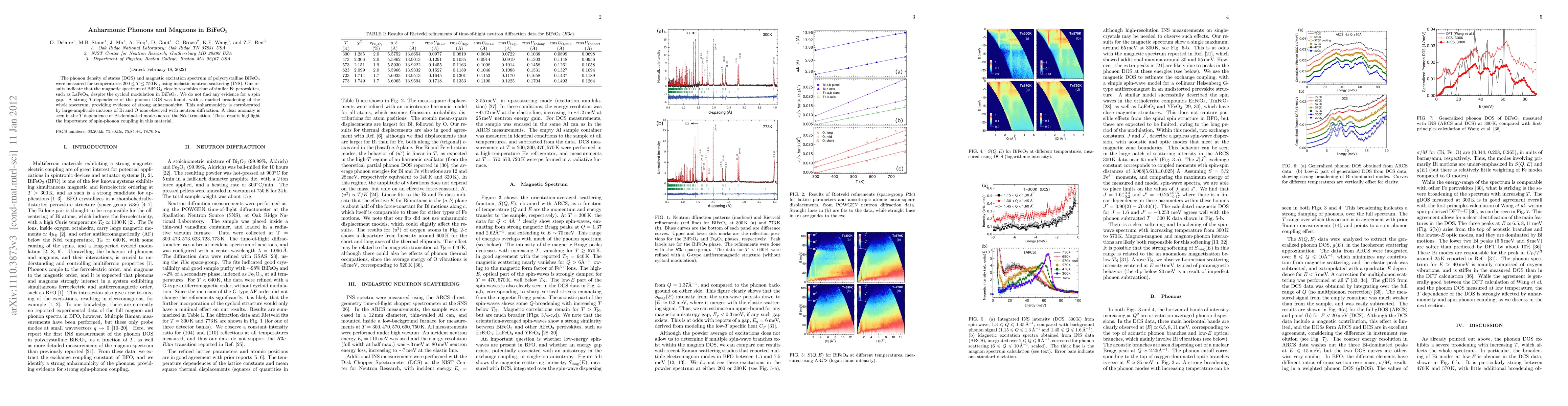 The phonon density of states (DOS) and magnetic excitation spectrum of polycrystalline BiFeO$_3$ were measured for temperatures $200 \leq T \leq 750\,$K, using inelastic neutron scattering (INS). Our results indicate that the magnetic spectrum of BiFeO$_3$ closely resembles that of similar Fe perovskites, such as LaFeO$_3$, despite the cycloid modulation in BiFeO$_3$. We do not find any evidence for a spin gap. A strong $T$-dependence of the phonon DOS was found, with a marked broadening of the whole spectrum, providing evidence of strong anharmonicity. This anharmonicity is corroborated by large-amplitude motions of Bi and O ions observed with neutron diffraction. These results highlight the importance of spin-phonon coupling in this material.