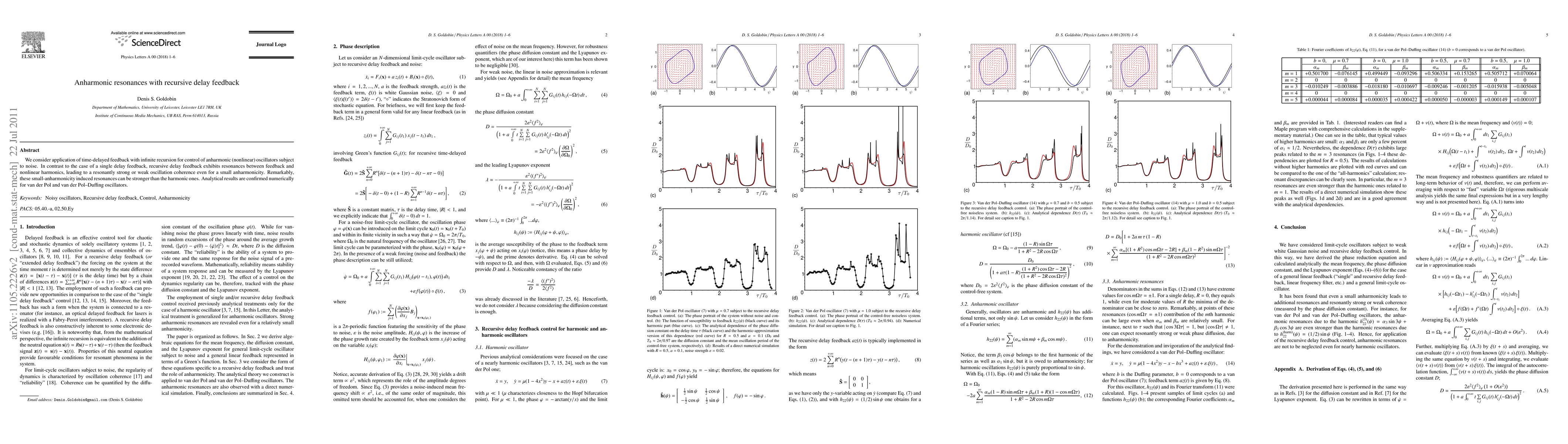 We consider application of the multiple time delayed feedback for control of anharmonic (nonlinear) oscillators subject to noise. In contrast to the case of a single delay feedback, the multiple one exhibits resonances between feedback and nonlinear harmonics, leading to a resonantly strong or weak oscillation coherence even for a small anharmonicity. Analytical results are confirmed numerically for van der Pol and van der Pol-Duffing oscillators. Highlights: > We construct general theory of noisy limit-cycle oscillators with linear feedback. > We focus on coherence and "reliability" of oscillators. > For recursive delay feedback control the theory shows importance of anharmonicity. > Anharmonic resonances are studied both numerically and analytically.