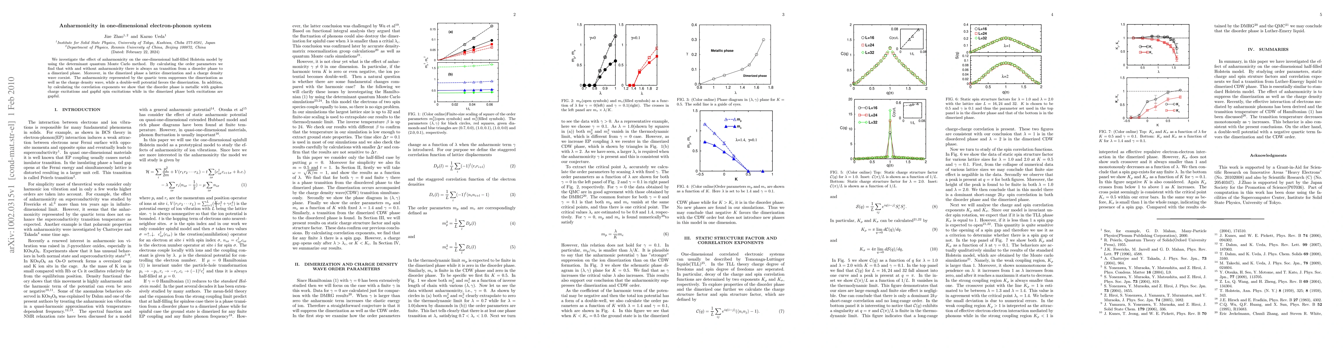 We investigate the effect of anharmonicity on the one-dimensional half-filled Holstein model by using the determinant quantum Monte Carlo method. By calculating the order parameters we find that with and without anharmonicity there is always an transition from a disorder phase to a dimerized phase. Moreover, in the dimerized phase a lattice dimerization and a charge density wave coexist. The anharmonicity represented by the quartic term suppresses the dimerization as well as the charge density wave, while a double-well potential favors the dimerization. In addition, by calculating the correlation exponents we show that the disorder phase is metallic with gapless charge excitations and gapful spin excitations while in the dimerized phase both excitations are gapful.