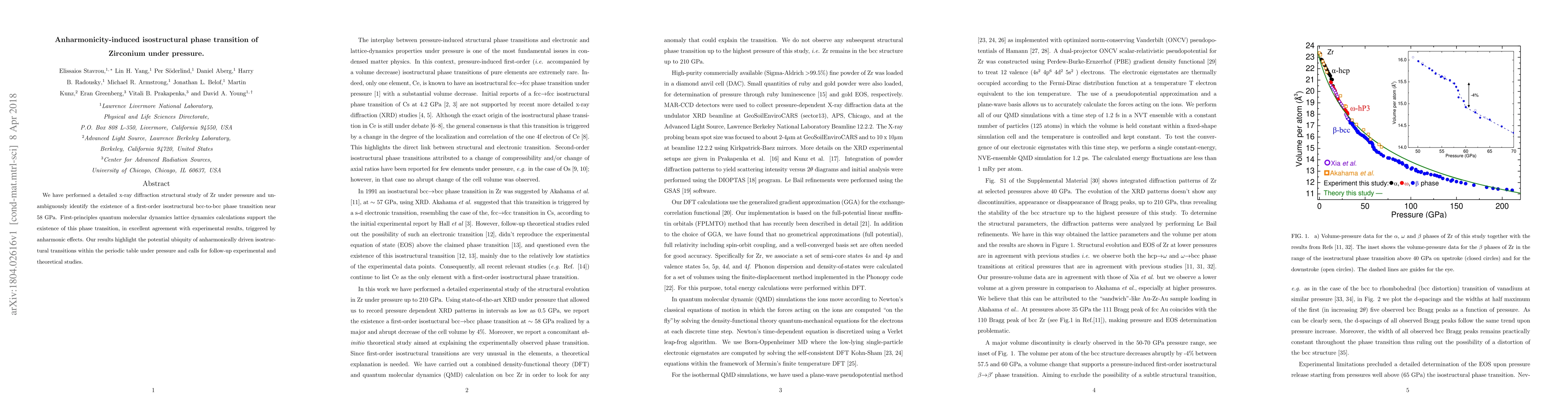 The study reveals a first-order isostructural bcc-to-bcc phase transition in zirconium near 58 GPa, driven by anharmonic effects, as confirmed by both experimental x-ray diffraction and theoretical calculations. This finding suggests a broader occurrence of such transitions under pressure.
