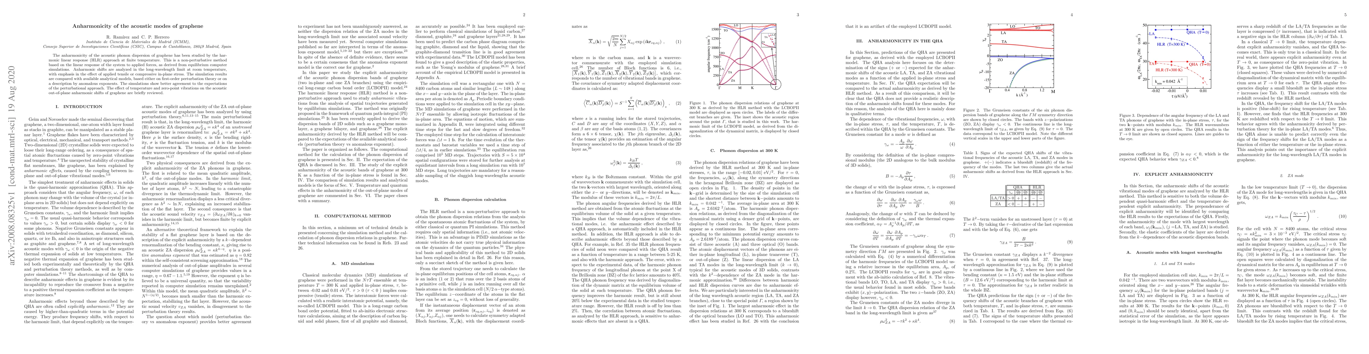 The anharmonicity of the acoustic phonon dispersion of graphene has been studied by the harmonic linear response (HLR) approach at finite temperature. This is a non-perturbative method based on the linear response of the system to applied forces, as derived from equilibrium computer simulations. Anharmonic shifts are analyzed in the long-wavelength limit at room temperature, with emphasis in the effect of applied tensile or compressive in-plane stress. The simulation results are compared with available analytical models, based either on first-order perturbation theory or on a description by anomalous exponents. The simulations show better agreement to the expectations of the perturbational approach. The effect of temperature and zero-point vibrations on the acoustic out-of-plane anharmonic shifts of graphene are briefly reviewed.