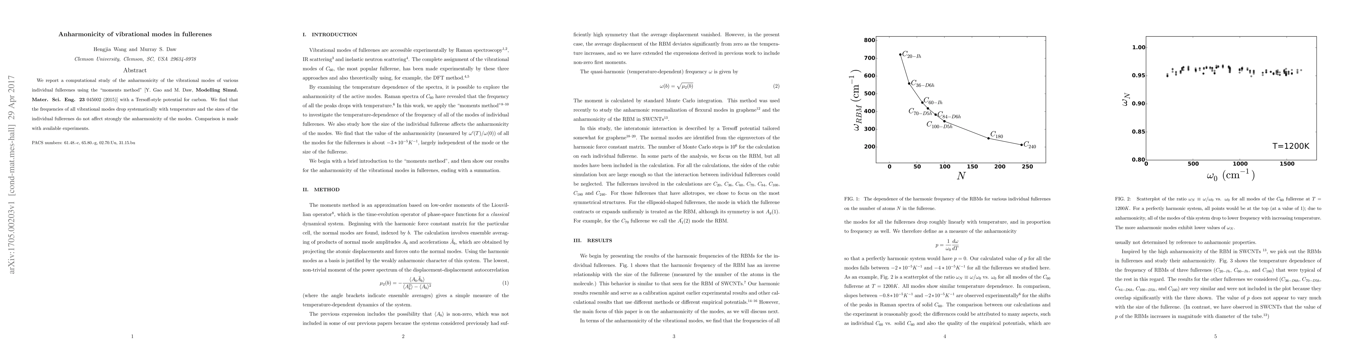 This study computationally investigates the anharmonicity of vibrational modes in fullerenes using the moments method and Tersoff-style potentials, revealing that vibrational frequencies decrease with temperature, with size having minimal impact on anharmonicity. Experimental comparisons support the findings.