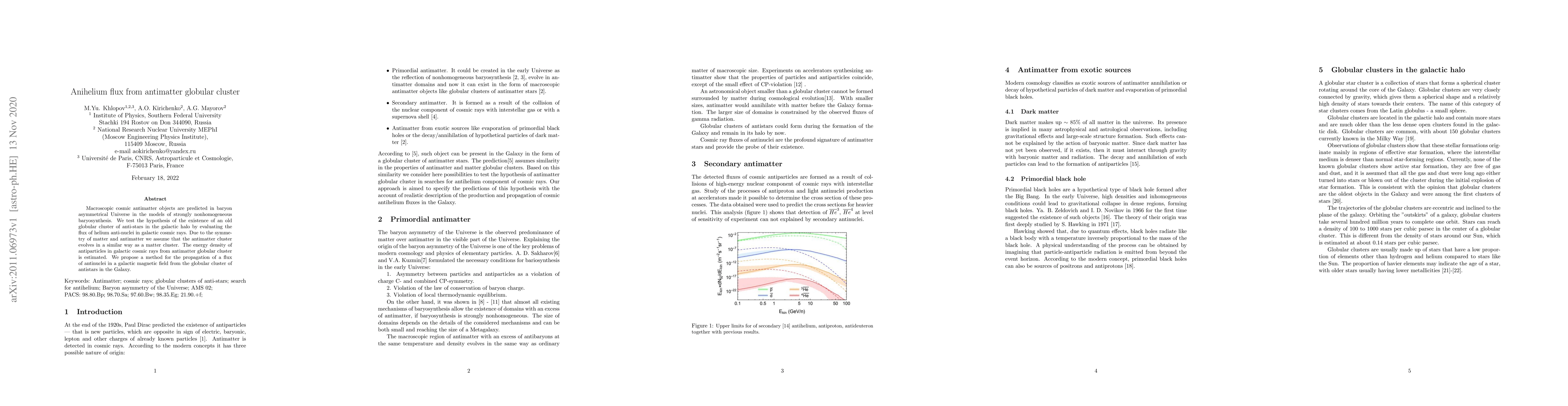 This paper investigates the potential existence of an antimatter globular cluster in the galactic halo by analyzing the flux of helium anti-nuclei in cosmic rays. It proposes a method to estimate the energy density of antiparticles and the propagation of antinuclei in the galactic magnetic field, based on the assumption that antimatter clusters evolve similarly to matter clusters.