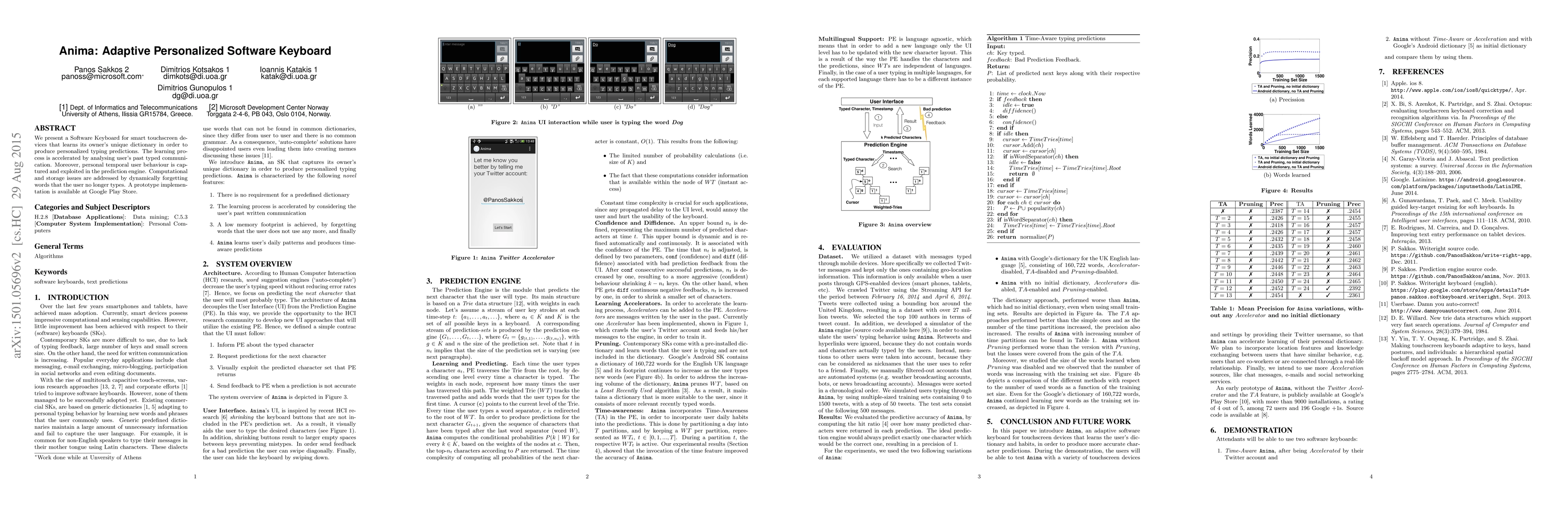 Anima is a smart touchscreen software keyboard that adapts to the user's unique typing habits by learning their personal dictionary and predicting future inputs. It dynamically forgets unused words to manage computational and storage efficiency.