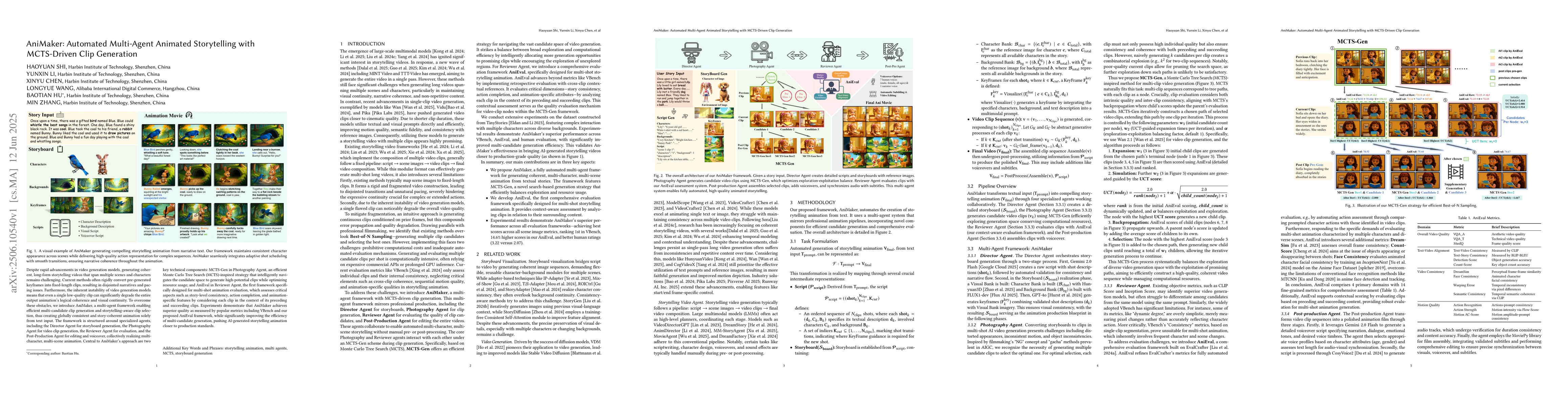 AniMaker creates coherent storytelling videos with a multi-agent framework that generates high-potential clips using MCTS-Driven Clip Generation, achieving superior quality while improving efficiency.