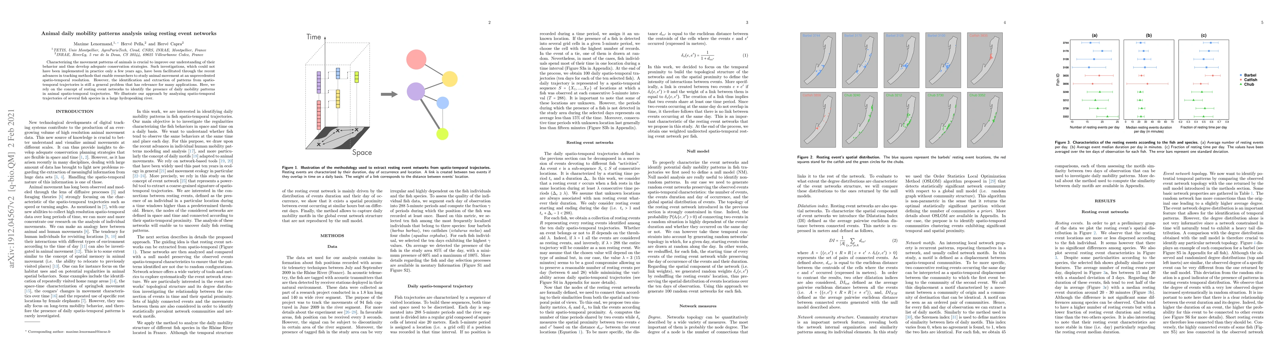 Characterizing the movement patterns of animals is crucial to improve our understanding of their behavior and thus develop adequate conservation strategies. Such investigations, which could not have been implemented in practice only a few years ago, have been facilitated through the recent advances in tracking methods that enable researchers to study animal movement at an unprecedented spatio-temporal resolution. However, the identification and extraction of patterns from spatio-temporal trajectories is still a general problem that has relevance for many applications. Here, we rely on the concept of resting event networks to identify the presence of daily mobility patterns in animal spatio-temporal trajectories. We illustrate our approach by analyzing spatio-temporal trajectories of several fish species in a large hydropeaking river.
