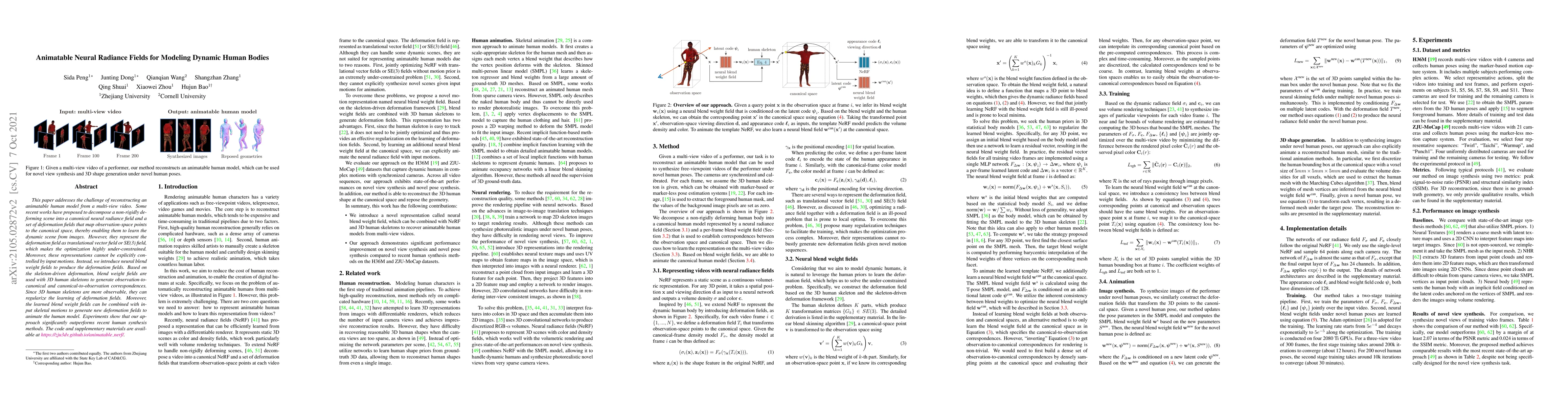 This paper addresses the challenge of reconstructing an animatable human model from a multi-view video. Some recent works have proposed to decompose a non-rigidly deforming scene into a canonical neural radiance field and a set of deformation fields that map observation-space points to the canonical space, thereby enabling them to learn the dynamic scene from images. However, they represent the deformation field as translational vector field or SE(3) field, which makes the optimization highly under-constrained. Moreover, these representations cannot be explicitly controlled by input motions. Instead, we introduce neural blend weight fields to produce the deformation fields. Based on the skeleton-driven deformation, blend weight fields are used with 3D human skeletons to generate observation-to-canonical and canonical-to-observation correspondences. Since 3D human skeletons are more observable, they can regularize the learning of deformation fields. Moreover, the learned blend weight fields can be combined with input skeletal motions to generate new deformation fields to animate the human model. Experiments show that our approach significantly outperforms recent human synthesis methods. The code and supplementary materials are available at https://zju3dv.github.io/animatable_nerf/.