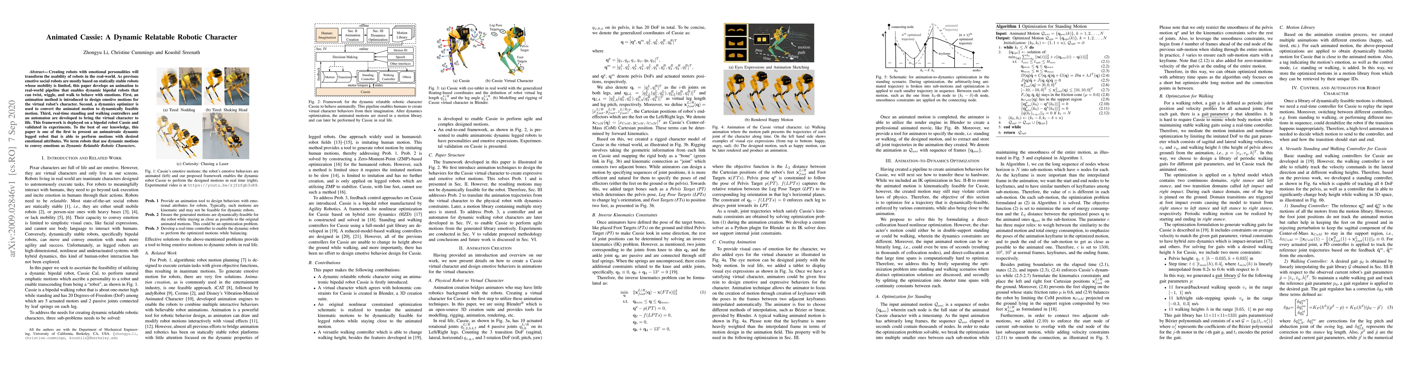 Creating robots with emotional personalities will transform the usability of robots in the real world. As previous emotive social robots are mostly based on statically stable robots whose mobility is limited, this paper develops an animation to real world pipeline that enables dynamic bipedal robots that can twist, wiggle, and walk to behave with emotions. First, an animation method is introduced to design emotive motions for the virtual robot character. Second, a dynamics optimizer is used to convert the animated motion to dynamically feasible motion. Third, real time standing and walking controllers and an automaton are developed to bring the virtual character to life. This framework is deployed on a bipedal robot Cassie and validated in experiments. To the best of our knowledge, this paper is one of the first to present an animatronic dynamic legged robot that is able to perform motions with desired emotional attributes. We term robots that use dynamic motions to convey emotions as Dynamic Relatable Robotic Characters.