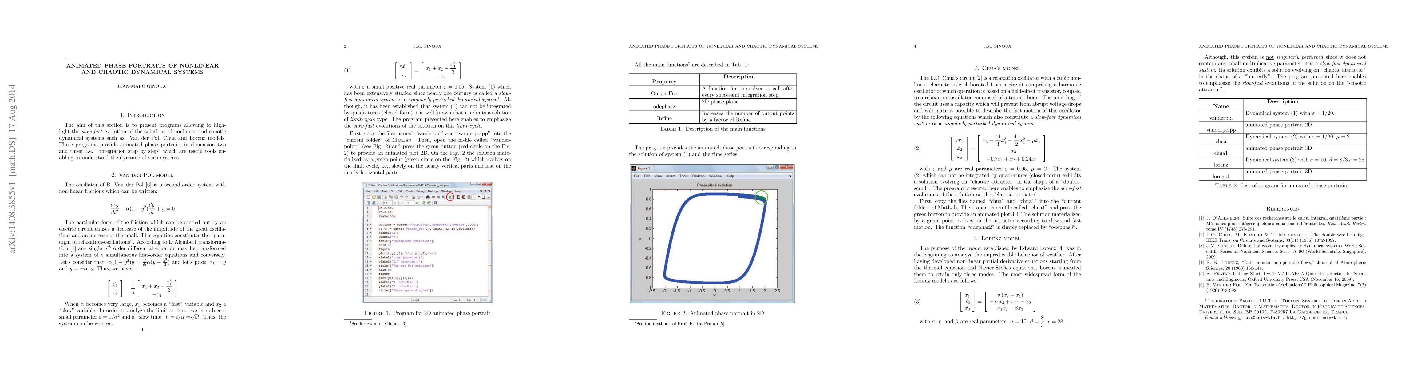 The aim of this section is to present programs allowing to high- light the slow-fast evolution of the solutions of nonlinear and chaotic dynamical systems such as: Van der Pol, Chua and Lorenz models. These programs provide animated phase portraits in dimension two and three, i.e. integration step by step" which are useful tools enabling to understand the dynamic of such systems.