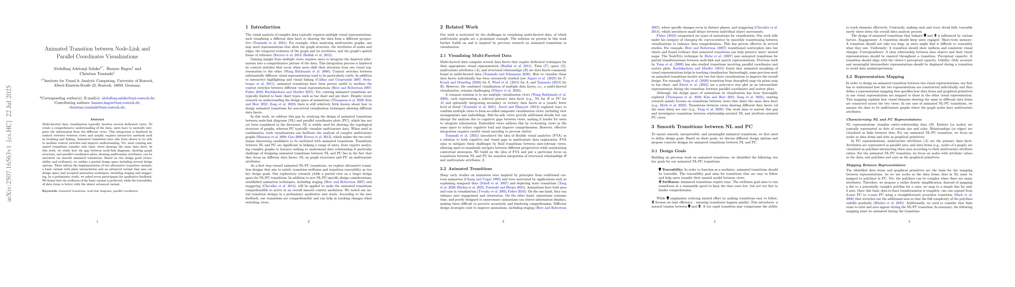 Multi-faceted data visualization typically involves several dedicated views. To create a comprehensive understanding of the data, users have to mentally integrate the information from the different views. This integration is hindered by context switches between views and usually requires interactive methods such as brushing and linking. Animated transitions have also been shown to be able to mediate context switches and improve understanding. Yet, most existing animated transitions consider only basic views showing the same data facet. In this work, we study how the gap between node-link diagrams, showing graph structure, and parallel coordinates plots, showing multivariate attributes, can be narrowed via smooth animated transitions. Based on two design goals (traceability and swiftness), we outline a partial design space including several design options. These inform the implementation of two alternative transition variants: a basic variant with plain interpolation and an advanced variant that uses our design space and accepted animation techniques, including staging and staggering. In a preliminary study, we asked seven participants for qualitative feedback. We found that the swiftness of the basic variant is preferred, while the traceability of data items is better with the slower advanced variant.