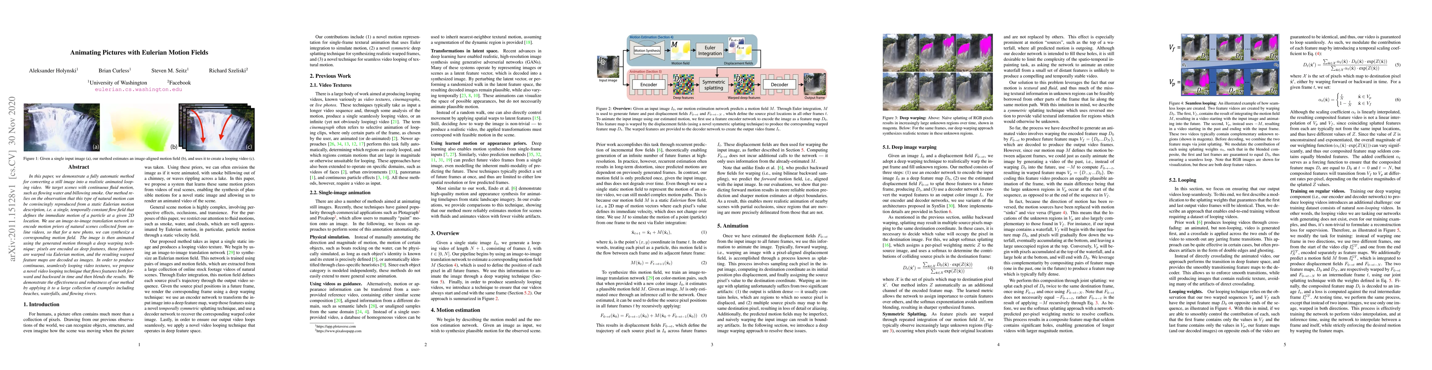 Researchers developed a method to automatically convert still images into realistic looping animated videos using Eulerian motion fields, which can convincingly reproduce natural fluid motion like flowing water or smoke.