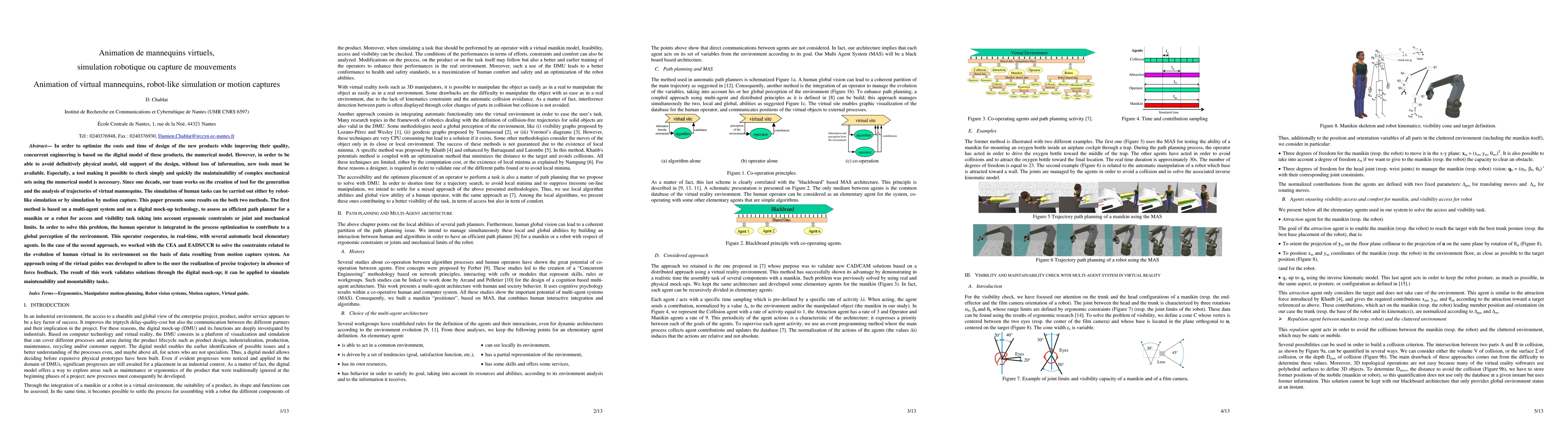 In order to optimize the costs and time of design of the new products while improving their quality, concurrent engineering is based on the digital model of these products, the numerical model. However, in order to be able to avoid definitively physical model, old support of the design, without loss of information, new tools must be available. Especially, a tool making it possible to check simply and quickly the maintainability of complex mechanical sets using the numerical model is necessary. Since one decade, our team works on the creation of tool for the generation and the analysis of trajectories of virtual mannequins. The simulation of human tasks can be carried out either by robot-like simulation or by simulation by motion capture. This paper presents some results on the both two methods. The first method is based on a multi-agent system and on a digital mock-up technology, to assess an efficient path planner for a manikin or a robot for access and visibility task taking into account ergonomic constraints or joint and mechanical limits. In order to solve this problem, the human operator is integrated in the process optimization to contribute to a global perception of the environment. This operator cooperates, in real-time, with several automatic local elementary agents. In the case of the second approach, we worked with the CEA and EADS/CCR to solve the constraints related to the evolution of human virtual in its environment on the basis of data resulting from motion capture system. An approach using of the virtual guides was developed to allow to the user the realization of precise trajectory in absence of force feedback. The result of this work validates solutions through the digital mock-up; it can be applied to simulate maintenability and mountability tasks.