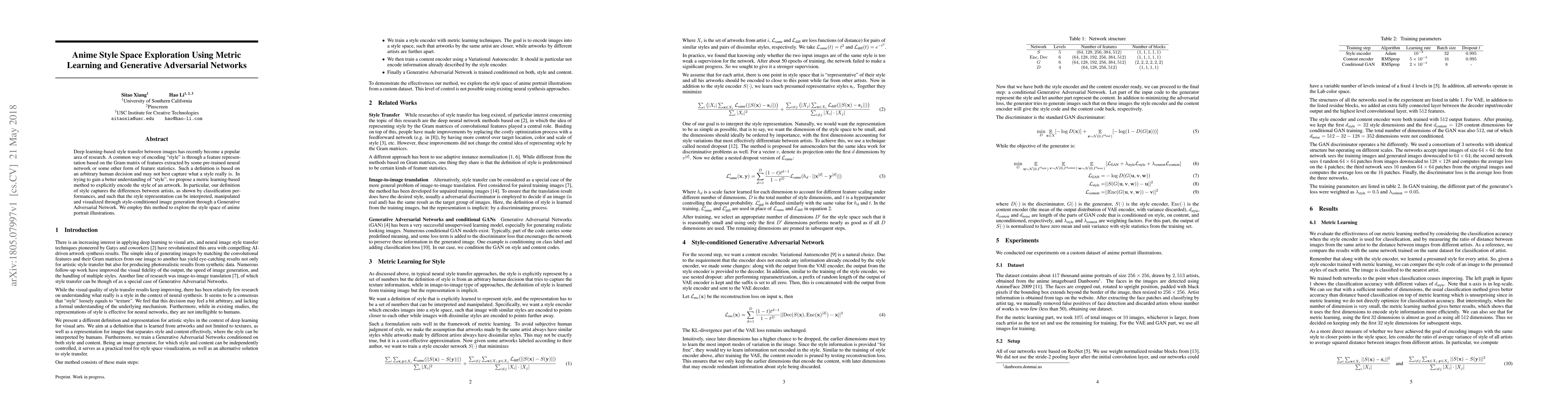 This paper proposes a metric learning-based method to encode the style of anime portraits, capturing differences between artists. It utilizes Generative Adversarial Networks for style-conditioned image generation, enabling exploration and manipulation of the anime style space.