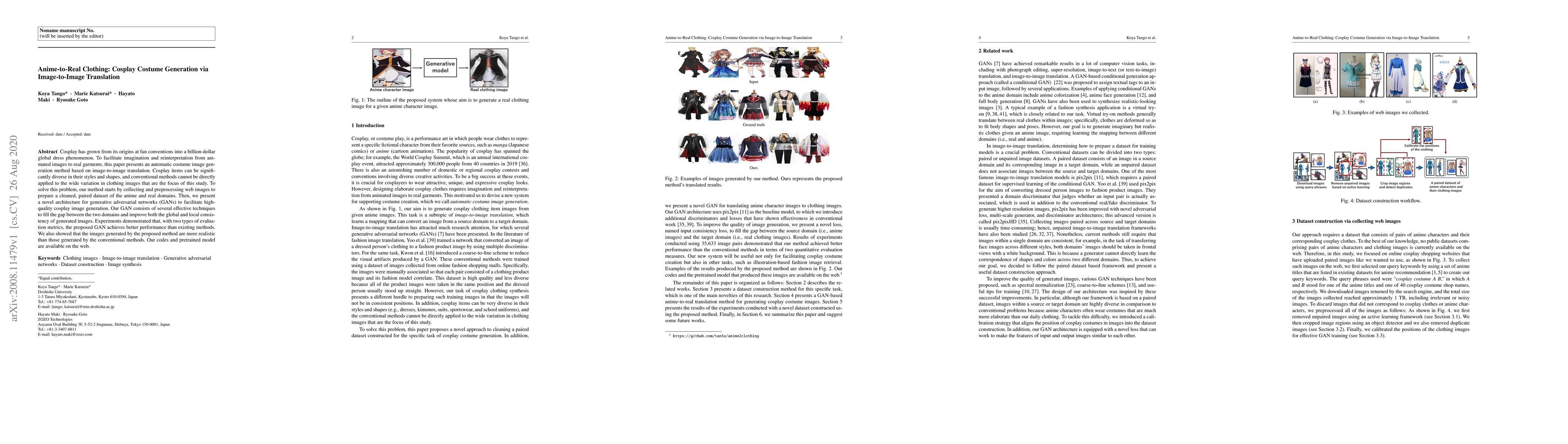 This paper introduces an automatic method for generating cosplay costumes from anime images using image-to-image translation via a novel generative adversarial network (GAN) architecture. The proposed GAN effectively bridges the gap between anime and real clothing, resulting in high-quality, realistic cosplay images that outperform existing methods.