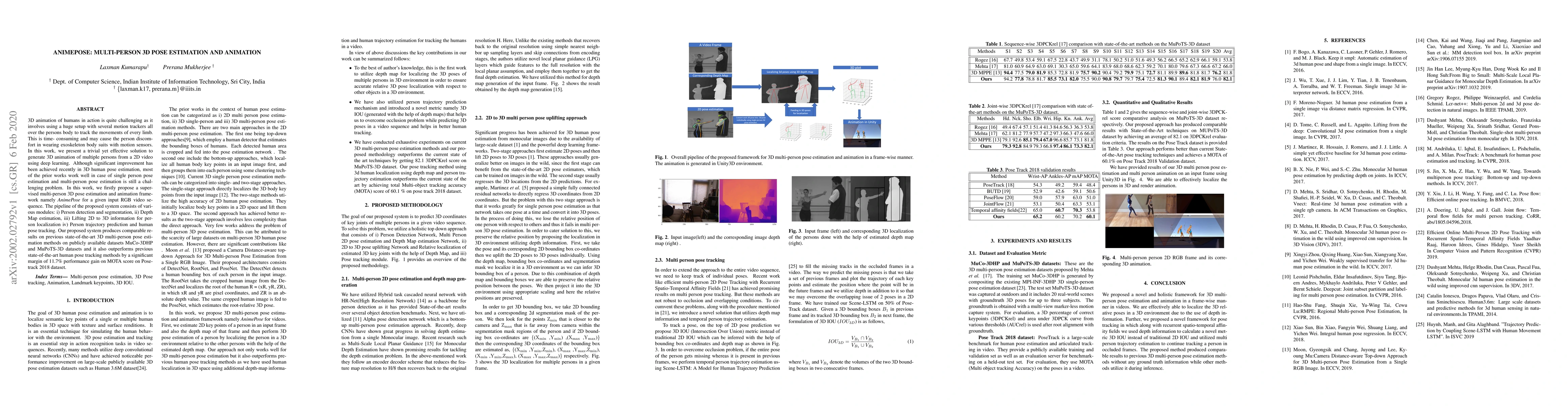 A novel framework for 3D multi-person pose estimation and animation in videos is proposed, utilizing depth information and a multi-scale local planar guidance approach.