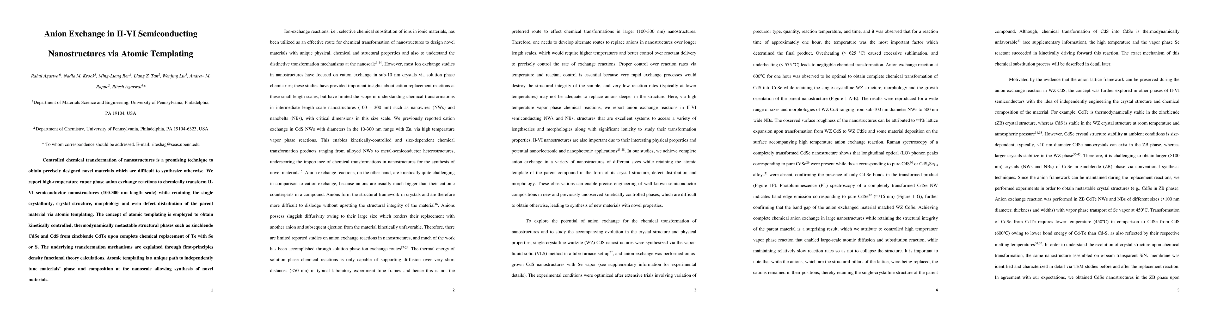 This paper reports a high-temperature vapor phase anion exchange method to transform II-VI semiconductor nanostructures while preserving their original crystallinity and morphology, using atomic templating. The technique enables the synthesis of thermodynamically metastable phases like zincblende CdSe and CdS from CdTe through precise chemical replacement.