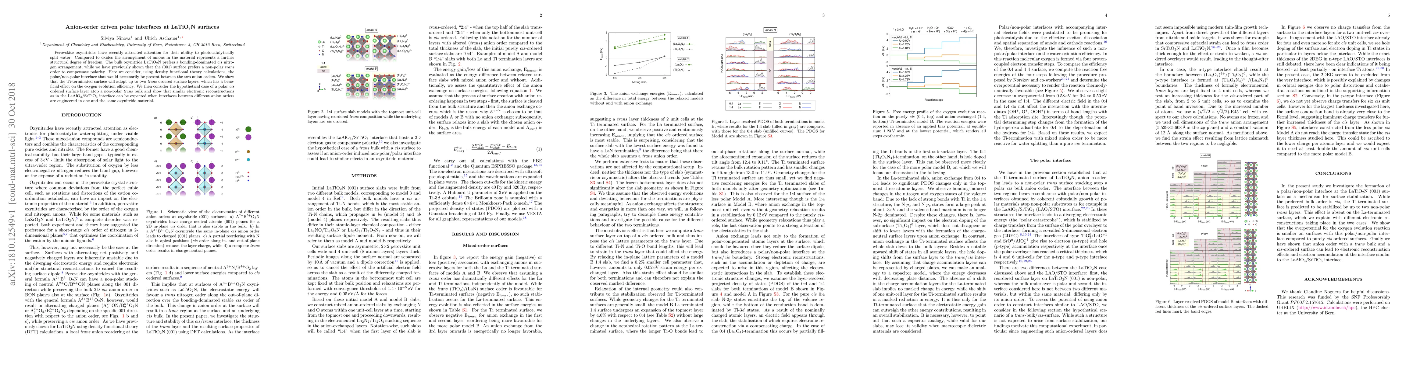 Perovskite oxynitrides have recently attracted attention for their ability to photocatalytically split water. Compared to oxides the arrangement of anions in the material represents a further structural degree of freedom. The bulk oxynitride LaTiO$_2$N prefers a bonding-dominated \textit{cis} nitrogen arrangement, while we have previously shown that the (001) surface prefers a non-polar \textit{trans} order to compensate polarity. Here we consider, using density functional theory calculations, the polar/non-polar interface that would necessarily be present between the two anion orders. We show that the Ti-terminated surface will adopt up to two \textit{trans} ordered surface layers, which has a beneficial effect on the oxygen evolution efficiency. We then consider the hypothetical case of a polar \textit{cis} ordered surface layer atop a non-polar \textit{trans} bulk and show that similar electronic reconstructions as in the LaAlO$_3$/SrTiO$_3$ interface can be expected when interfaces between different anion orders are engineered in one and the same oxynitride material.