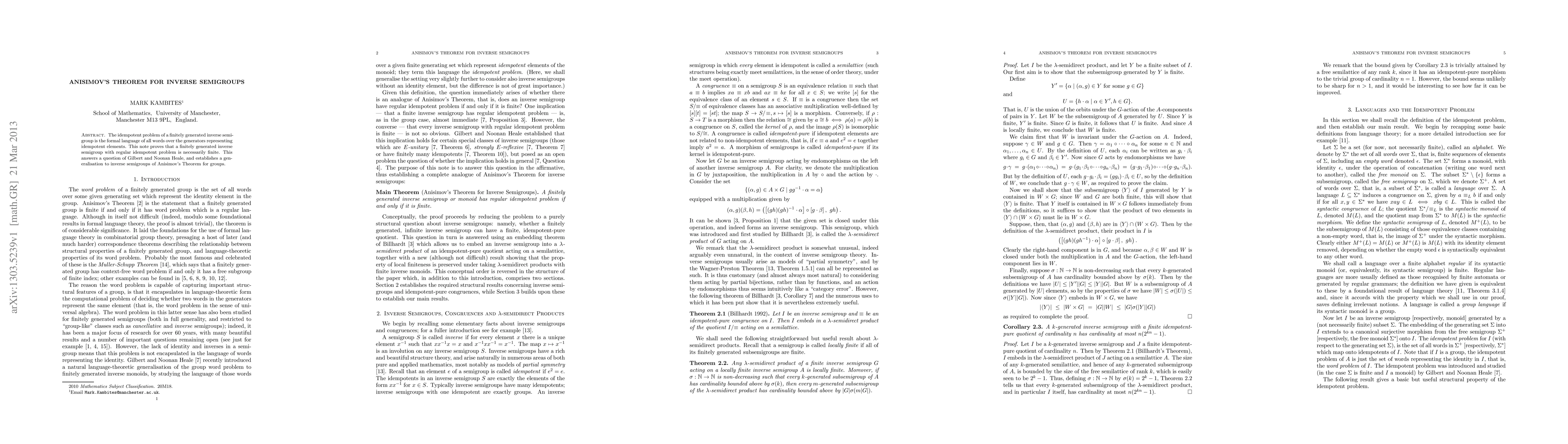 Anisimov's Theorem for groups is generalized to finitely generated inverse semigroups, proving that those with a regular idempotent problem must be finite, thus resolving a question posed by Gilbert and Noonan Heale.
