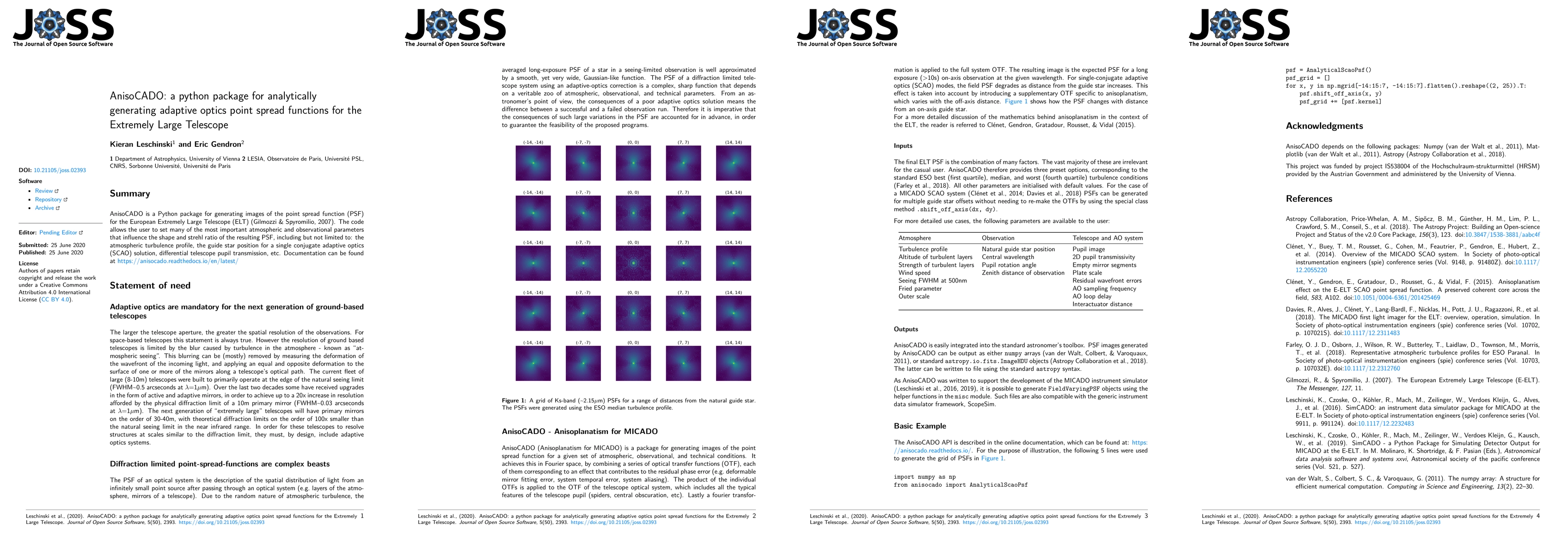 AnisoCADO is a Python package designed to generate adaptive optics point spread functions (PSF) for the Extremely Large Telescope (ELT). It allows users to customize various atmospheric and observational parameters to influence the PSF shape and Strehl ratio.