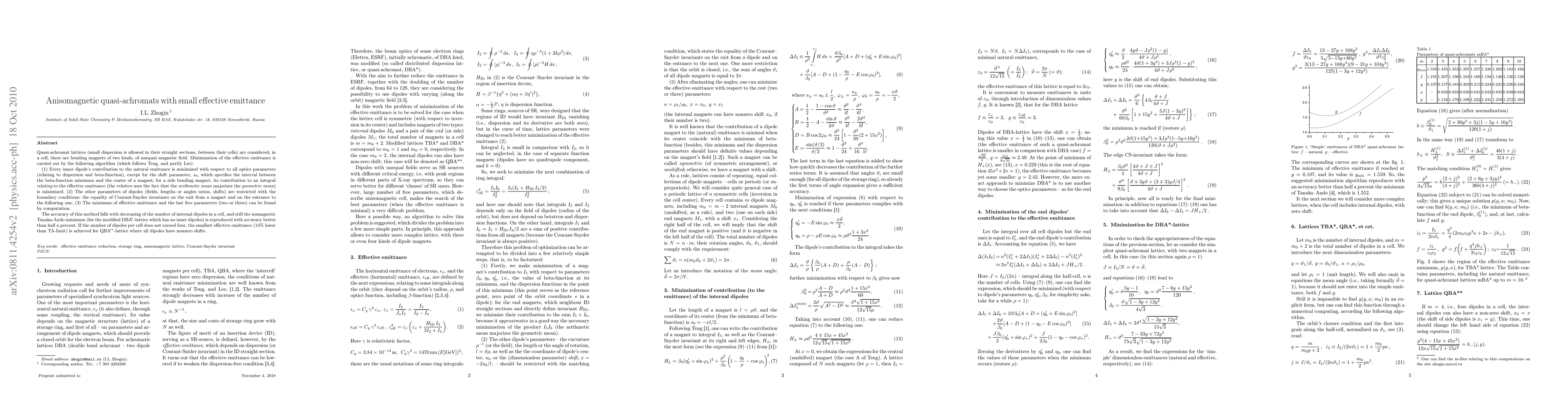 Quasi-achromat lattices (small dispersion is allowed in their straight sections, between their cells) are considered; in a cell, there are bending magnets of two kinds, of unequal magnetic field. Minimization of the effective emittance is carried out by the following algorithm (which follows Teng, and partly Lee). (1) Every inner dipole's contribution to the natural emittance is minimized with respect to all optics parameters (relating to dispersion and beta-function), except for the shift parameter, s_0, which specifies the interval between the beta-function minimum and the center of a magnet; for a side bending magnet, its contribution to an integral relating to the effective emittance (the relation uses the fact that the arithmetic mean majorizes the geometric mean) is minimized. (2) The other parameters of dipoles (fields, lengths or angles ratios, shifts) are restricted with the boundary conditions: the equality of Courant-Snyder invariants on the exit from a magnet and on the entrance to the following one. (3) The minimum of effective emittance and the last free parameters (two or three) can be found by computation. The accuracy of this method falls with decreasing of the number of internal dipoles in a cell, and still the isomagnetic Tanaka-Ando minimum (for the modified DBA*-lattice which has no inner dipoles) is reproduced with accuracy better than half a percent. If the number of dipoles per cell does not exceed four, the smallest effective emittance (14% lower than TA-limit) is achieved for QBA**-lattice where all dipoles have nonzero shifts.