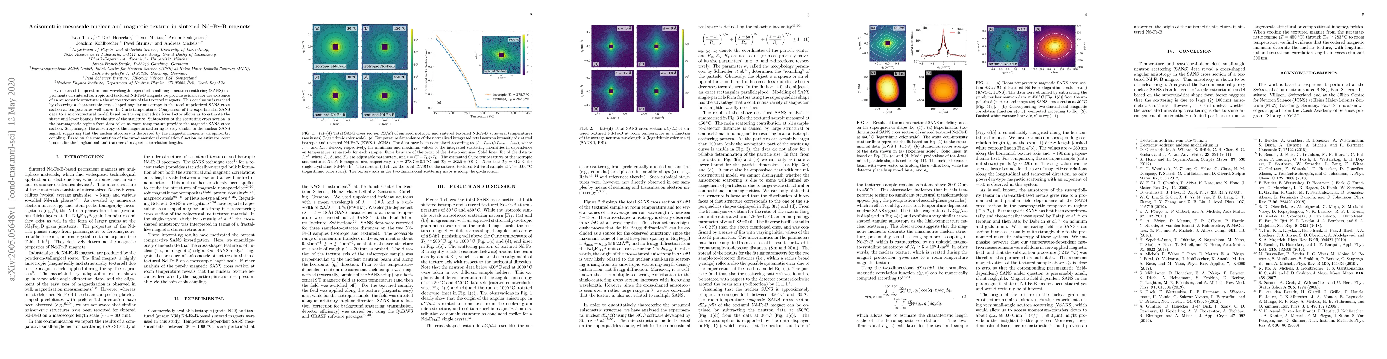 This study uses temperature and wavelength-dependent small-angle neutron scattering (SANS) to reveal an anisometric mesoscale structure in textured Nd-Fe-B magnets, characterized by a cross-shaped angular anisotropy. The magnetic SANS cross section closely mirrors the nuclear SANS signal, indicating a strong correlation between nuclear structure and magnetic moments.